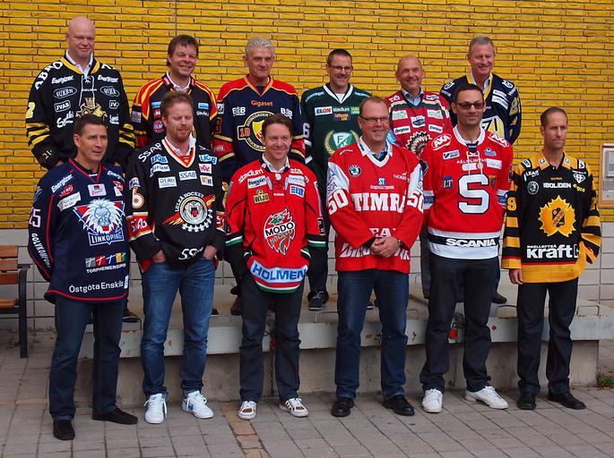 | Keywords: Elitserien coaches 2010.jpg en Coaches of the Swedish Elitserien league Top row from left Roger Melin - AIK Niklas Czarnecki - Brynäs Hardy Nilsson - Djurgården Tommy Samuelsson - Färjestad Kent Johansson - Frölunda Jan Karlsson - HV71 Bottom row from left Hans Särkijärvi - Linköping Jonas Rönnqvist - Luleå Charles Berglund - Modo Per-Erik Johnsson - Timrå Peter Popovic - Södertälje Anders Forsberg - Skellefteå own Armigo 2010-09 Ice hockey coaches from Sweden September 2010 in Sweden Charles Berglund Roger Melin Hardy Nilsson 2010-2011 Swedish Elite League season People of Sweden in 2010 September 2010 photographs Hans Särkijärvi Kent Johansson ice hockey Tommy Samuelsson Peter Popovic Per-Erik Johnsson Anders Forsberg ice hockey coach Jan Karlsson ice hockey born 1958 Niklas Czarnecki Jonas Rönnqvist Cc-zero |