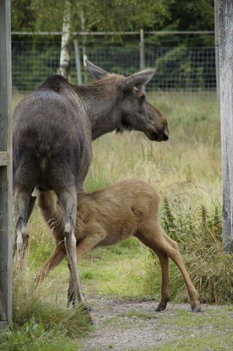 Keywords: elk park moose elche young animal suckle mammal enclosure zoo sweden moose cow mother and child mother child mother with child