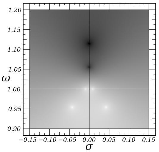 | Keywords: Elliptic Filter s-Plane Response (8th Order, Detail).svg elliptic filter Values less than 0 0001 are black; greater than 10 are in white 1 05 0 5 and <sub>0</sub> 1 own Inductiveload date Mathematica Code <pre><nowiki> xp2xi_ Module g num den g Sqrt4 xi 2 + 4 xi 2 xi 2 - 1 2/3 ; num 2 xi 2 Sqrtg; den Sqrt8 xi 2 xi 2 + 1 + 12 g xi 2 - g 3 - Sqrtg 3; num/den; xz2xi_ xi 2/xp2xi; txi_ Sqrt1 - 1/xi 2; Use particular values for low-order functions r1xi_ x_ x; r2xi_ x_ txi + 1 x 2 - 1 / txi - 1 x 2 + 1 ; r3xi_ x_ x 1 - xp2xi x 2 - xz2xi / 1 - xz2xi x 2 - xp2xi ; Use nesting property for higher-degree functions r4xi_ x_ r2r2xi xi r2xi x; r8xi_ x_ r4r2xi xi r2xi x; ellgainxi_ w_ w0_ ep_ 1/Sqrt1 + ep 2 r8xi w/w0 2; DensityPlot w0 1; ep 0 5; xi 1 05; min 0 0001; max 10; LogAbs ellgainxi sig + I w w0 I ep sig -0 15 0 15 w 0 9 1 2 PlotRange -> Logmin Logmax PlotPoints -> 100 ColorFunction -> GrayLevel ClippingStyle -> Black White Frame -> False ImageSize -> 2000 </nowiki></pre> Elliptic filters Pole-zero plots |