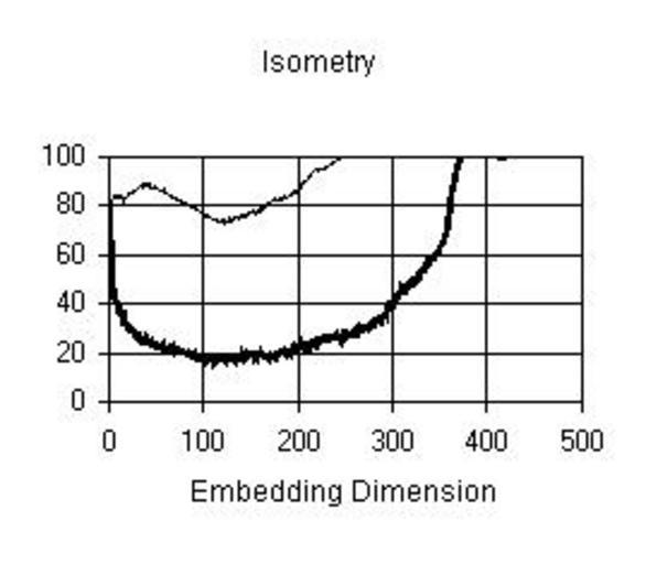 Keywords: Embedding plot for g=4.62 r=10.JPG Embedding plot with embedding dimensions 1 497 of the series generated with the process equation with gain 4 62 initial condition of 0 4 and 500 data points Radius used for calculating isometries is 0 001 5000 random comparisons were done for each embedding dimension for series and its shuffled copy 2006-02-06 own assumed Lakinekaki~commonswiki Logistics |