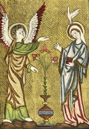 | Keywords: Embroidered bookbinding 13th century Annunciation.jpg Embroidered bookbinding The earliest example of an embroidered book in existence is I believe the manuscript English Psalter written in the thirteenth century which afterwards belonged to Anne daughter of Sir Simon de Felbrigge K G standard-bearer to Richard ii Anne de Felbrigge was a nun in the convent of Minoresses at Bruisyard in Suffolk during the latter half of the fourteenth century and it is quite likely that she herself worked the cover ”such work having probably been largely done in monasteries and convents during the middle ages On the upper side is a very charming design of the Annunciation and on the under another of the Crucifixion each measuring 7¾ by 5¾ inches In both cases the ground is worked with fine gold threads 'couched' in a zigzag pattern the rest of the work being very finely executed in split-stitch by the use of which apparently continuous lines can be made each successive stitch beginning a little within that immediately preceding it ”the effect in some places being that of a very fine chain-stitch The lines of this work do not in any way follow the meshes of the linen or canvas as is mostly the case with book-work upon such material but they curve freely according to the lines and folds of the design English Embroidered Bookbindings by Cyril James Humphries Davenport F S A edited by Alfred Pollard London 1899 gutenberg English Embroidered Bookbindings 17585 Image published 1899 Embroidery is a Victorian restoration of 16th century original author PD-old Embroidered book covers Medieval art Miniatures of annunciation 13th-century art People with Doves in Christian art People with flowers in art Embroidery of England Close-ups of woven textiles Opus Anglicanum |