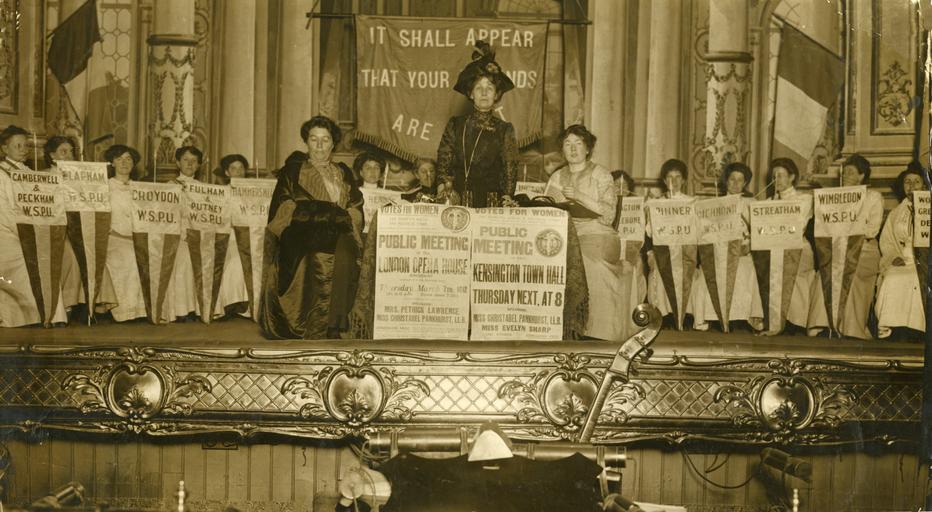 | Keywords: suffrage the women's library thewomenslibrary women history politics hires architecture monochrome 7JCC/O/02/004aPhotograph, printed, paper, monochrome, Mrs Pankhurst speaking at the London Pavilion, flanked by Emmeline Pethick Lawrence and Christabel Pankhurst, with representatives of WSPU branches also on the platform; printed on reverse 'General Press Photo Company, 2 Bream's Buildings, Chancery Lane. Telegrams: 'Illupresto', London; Telephone: City.. Please acknowledge GPP' 7JCC/O/02/004aPhotograph, printed, paper, monochrome, Mrs Pankhurst speaking at the London Pavilion, flanked by Emmeline Pethick Lawrence and Christabel Pankhurst, with representatives of WSPU branches also on the platform; printed on reverse 'General Press Photo Company, 2 Bream's Buildings, Chancery Lane. Telegrams: 'Illupresto', London; Telephone: City.. Please acknowledge GPP' |