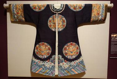 | Keywords: Empress or empress dowager's long gua (surcoat), China, Qing dynasty, late 19th century, silk, metal-wrapped silk, view 1 - Textile Museum, George Washington University - DSC09472.JPG en Exhibit in the Textile Museum George Washington University Washington DC USA Photography was permitted in the museum without restriction This work is old enough so that it is in the public domain 2015-03-26 15 09 52 own Daderot other versions PD-old-70 cc-zero Textiles of China in the Textile Museum George Washington University Imperial clothing of China |