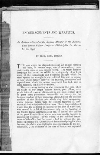 Keywords: Encouragements and Warnings p03.JPG en Speech of National Civil Service Reform League president Carl Schurz before its annual meeting of December 10 1896 in Philadelphia p 3 Single page scan 200 dpi Carl Schurz Encouragements and Warnings National Civil Service Reform League 1896; courtesy of Boston Public Library Carl Schurz 1896-12-10 PD-Old Encouragements and Warnings Page Images |