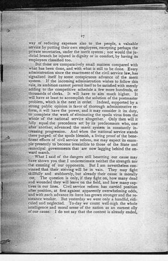 Keywords: Encouragements and Warnings p27.JPG en Speech of National Civil Service Reform League president Carl Schurz before its annual meeting of December 10 1896 in Philadelphia p 27 Single page scan 200 dpi Carl Schurz Encouragements and Warnings National Civil Service Reform League 1896; courtesy of Boston Public Library Carl Schurz 1896-12-10 PD-Old Encouragements and Warnings Page Images |