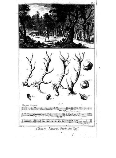 Keywords: Encyclopedie volume 2b-041.png PLANCHE Iere De la venerie La quête du cerf de la composition de Rhidinger peintre allemand LA vignette représente une forêt dans le fond de laquelle on voit un cerf sur le devant un piqueur tenant le trait du limier qui marche devant lui déployé Le limier a la botte au col voyez Pl VII le valet du limier n'est pas censé voir le cerf; mais il suit le limier qui le conduit sur les voies ou pas du cerf Voici la maniere de dresser le limier Fig 1 Tête d'un jeune cerf 2 Tête d'un cerf dix cors jeunement 3 Tête d'un cerf dix cors 4 Tête d'un vieux cerf a meules ou bosses où tient la fraize b fraize ou pierrure c mairin ou perche d gouttieres e andouillers ou cors f empaumure Les premieres têtes que portent les cerfs se nomment dagues Elles leur viennent au commencement de leur seconde année naissent de leurs meules ou bosses qu'ils poussent à un an; au bout de leur seconde année ils mettent bas leurs dagues Book Encyclopedie Planches 2b 040 042 PD-old-100-1923 Cervus elaphus antlers Hunting in art Antlers in art Encyclopédie ou Dictionnaire raisonné des sciences des arts et des métiers volume 2b 041