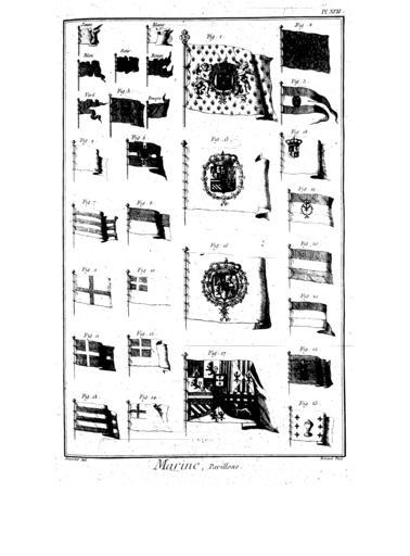 Keywords: Encyclopedie volume 6-143.png Planches de l'Encyclopédie de Diderot et d'Alembert volume 6 Flag chart from French Encyclopédie part 1 of 8 showing hatching conventions to represent heraldic tinctures royal France royal standards of Spain etc Encyclopédie flag chart 1 2 3 4 5 6 7 8 Key summarized in translation from captions in image File Encyclopedie volume 6-108 png 1 Royal flag of France 2 French royal galleys 3 Other French royal galleys flag 4 Blank white French royal flag 5 French merchant flag 6 French merchant 1689 7 Other French merchant 8 Normandy 9 Provence 10 Marseilles 11 Calais 12 Dunkirk 13 Other Dunkirk 14 Other Dunkirk 15 Spanish royal flag 16 Other Spanish royal 17 Spanish Hapsburg flag 18 Castile and Leon 19 Spanish galleys 20 Red-yellow-blue Spanish horizontal tricolor 21 Other Spain 22 Barcelona 23 Galicia Encyclopédie ou Dictionnaire raisonné des sciences des arts et des métiers volume 6 PD-old Flag charts |