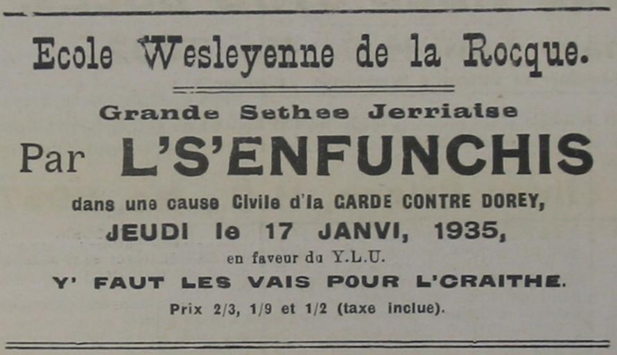 | Keywords: Enfuntchis La Rocque 17 Janvyi 1935.jpg Advertisement for theatrical play performance 17 January 1935 by Jèrriais acting troupe L's Enfuntchis Advertisement from newspaper Les Chroniques de Jersey January 1935 Own 2007-10-14 Man vyi Advertisements in Jersey Jèrriais 17 January Newspapers of Jersey Grouville 1935 advertisements 1935 in theatre Theatre of Jersey January 1935 | ||||