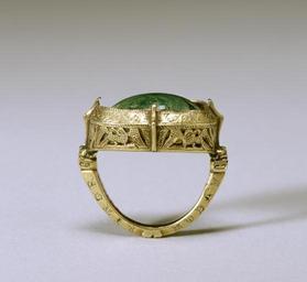 | Keywords: English - Bishop's Ring - Walters 57481 - View A.jpg This elaborate bishop's ring has the typical combination of a gold setting with a single large stone in this case malachite The gold is decorated with openwork eagles animal heads and floral elements The malachite is probably meant to resemble toadstone a green stone said to be found on the head of a toad and believed to have healing qualities These rings had to be large as bishops normally wore them over gloves on the third finger of the right hand century 13 Medieval gold and malachite cm 3 18 3 18 accession number 57 481 22345 Sale Joseph Brummer New York Henry Walters city Baltimore Walters Art Museum Henry Walters Acquired by Henry Walters 1927 Transcription AVE MARIA GR/ATIA PLENA D/; Translation Hail Mary full of grace Exhibition of Gold Cleveland Museum of Art Cleveland 1947-1948 The Medieval Craftsman and His Modern Counterpart Indiana University Art Museum Bloomington; Newcomb Art Gallery Tulane University New Orleans 1959 World of Wonder Walters Art Gallery Baltimore 1971-1972 Jewelry - Ancient to Modern Walters Art Gallery Baltimore 1979-1980 Bedazzled 5 000 Years of Jewelry from the Walters Art Museum en Frist Center for the Visual Arts Frist Center for the Visual Arts Nashville; The John and Mable Ringling Museum of Art Sarasota; The Walters Art Museum Baltimore 2006-2009 Bedazzled 5 000 Years of Jewelry El Paso Museum of Art El Paso 2010 place of origin England United Kingdom Walters Art Museum license Medieval metalwork in the Walters Art Museum Jewellery in the Walters Art Museum Gothic art in the United Kingdom Media contributed by the Walters Art Museum needs category review Bishop rings |