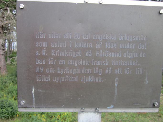 Keywords: English Cemetery at Fårö (3).jpg en Sign at the English Cemetery in the Swedish island of Fårö The sign reads Here lies some 20 English navy men who died of cholera in 1854 during the so-called Crimean War when Fårösund served as a base for a Anglo-French naval unit NW of the cemetery where the place of a currently set up hospital sv Skylt vid Engelska kyrkogården på Fårö Skylten lyder Här vilar ett 20-tal engelska örlogsmän som avled i kolera år 1854 under det s k Krimkriget då Fårösund utgjorde bas för en engelsk-fransk flottenhet NV om kyrkogården låg då ett för tillfället upprättat sjukhus own Mr Bullitt 2010-08-07 Engelska kyrkogården |