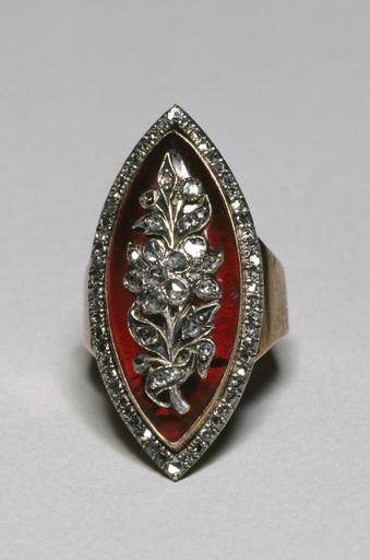Keywords: English - Ring with Floral Motif - Walters 571776 - Top.jpg In the late 18th century and into the 19th century marquise rings set with diamonds on dark blue or red enamel backgrounds became fashionable in Europe The oval marquise bezel like this ring and the rectangular shuttle-shaped bezel were the most popular shapes with diamonds set to imitate stars in the sky or floral sprays It was charactersitic to frame these rings with a border of diamond sparks set in silver mounts late Other date century 18 gold silver enamel diamond cm 3 33 1 75 accession number 57 1776 21927 Henry Walters Baltimore date and mode of acquisition unknown Laura F Delano New York date of acquisition unknown by gift Walters Art Museum Gift of Laura F Delano 1947 Jewelry - Ancient to Modern The Walters Art Gallery Baltimore 1979-1980 Bedazzled 5 000 Years of Jewelry from the Walters Art Museum Frist Center for the Visual Arts Nashville; The John and Mable Ringling Museum of Art Sarasota; The Walters Art Museum Baltimore 2006-2009 Bedazzled 5 000 Years of Jewelry El Paso Museum of Art El Paso 2010 place of origin England United Kingdom Walters Art Museum license Jewellery in the Walters Art Museum Art of England Media contributed by the Walters Art Museum needs category review Media contributed by the Walters Art Museum needs artist update |