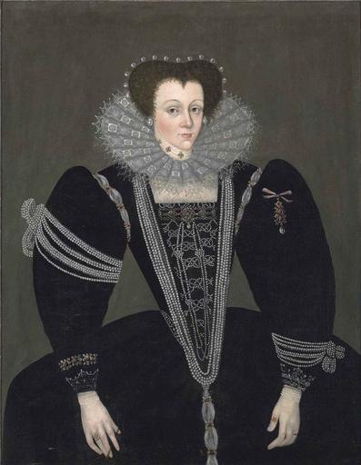 Keywords: English School Portrait of a Lady in a black dress with pearls c. 1590.jpg Portrait of a lady three-quarter-length in a black dress embellished with jewels and pearls a lace ruff and a pearl headdress by English School c 1590 ca 1590 Technique oil canvas in 45 625 35 625 object history Francis Leybourne Popham of Littlecote Wiltshire credit line accession number Christie's online 6392 285 5675133 PD-old-100 1590s portrait paintings 16th-century portraits of women at three-quarter length Ruffs in art female Lace in art |