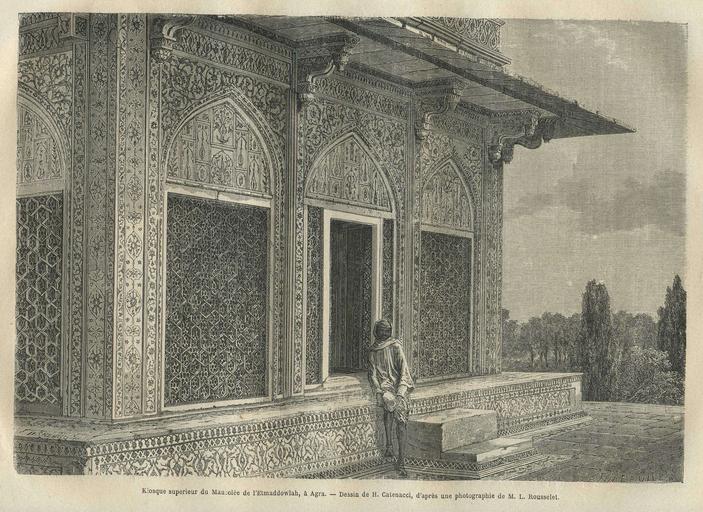 Keywords: Engraving1872bmax.jpg en Upper Kiosk of the Mausoleum of Etmad-Dowlah at Agra from 'Le Tour du Monde' 1872; click on the image for a very large scan Source ebay Oct 2004 1872 http //www columbia edu/itc/mealac/pritchett/00routesdata/1600_1699/jahangir/itimadtomb/itimadtomb html author PD-Art Uploaded with UploadWizard Buildings in Agra |