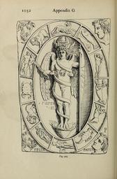 | Keywords: Engraving of a marble relief of Phanes.jpg en This equation is presupposed by a relief fig 909 which seems to have come more than a century since from Rome and is now exhibited in the Royal Museum no 2676 at Modena On a thick slab of white marble 0 71m high 0 49m wide is an oval band enclosing an egg-shaped recess The band is decorated with twelve signs of the zodiac and grouped about it are winged heads representing the four winds of heaven Within the recess stands a nude youth encumbered with a plethora of attributes Above his head and beneath his feet are the two halves of an egg from each of which flames are bursting A snake coiled round him rears its head on to the upper egg-shell He has two large wings and a crescent on his back the head of a lion growing from his front and the heads of a goat and a ram projecting from his right and left sides Instead of feet he has cloven hoofs In his right hand he grasps a thunderbolt in his left a sceptre The egg-like recess in which the god is placed the upper and lower shells from which he has emerged the strange animal-heads on his flanks the snake's head appearing above his face all mark him as Phanes 1914 https //archive org/stream/zeusstudyinancie02cook/zeusstudyinancie02cook page/1052/mode/1up Zeus a study in ancient religion - fig 909 - page 1052 Arthur Bernard Cook 1868 “1952 other versions Custom license marker 2015 03 13 PD-old Uploaded with UploadWizard Phanes deity Engravings of Greek deities 1914 engravings |