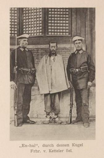 | Keywords: Enhai.jpg en En Hai the murder of en Clemens von Ketteler zh 打死克林德的清兵恩海 In und um Peking wahrend der Kriegswirren 1900-1901 Dr Wang Meerscheidt- Hullessem 1900 PD-old Source In und um Peking wahrend der Kriegswirren 1900-1901 Boxer Rebellion 1900 deaths Qing Dynasty Criminals from China |