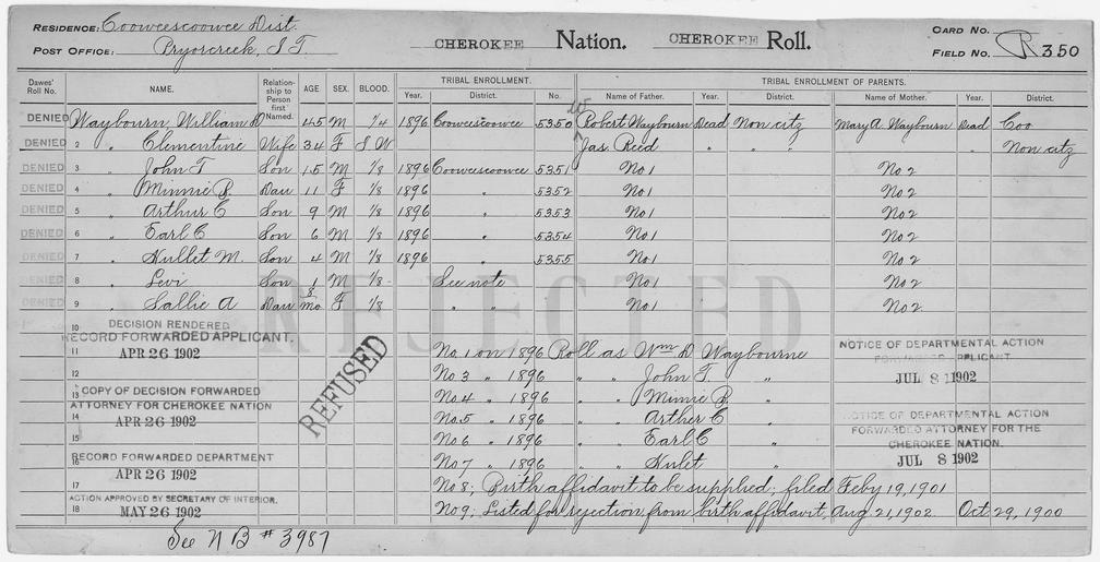 | Keywords: Enrollment for Cherokee Census Card R350 - NARA - 259413.tif Scope and content Name James Reed Type Parent Sex Male Name Arthur C Waybourn Type Rejected Age 9 Sex Male Degree Indian Blood 1/8 City of Residence Pryorcreek Name Clementine Waybourn Type Rejected Age 34 Sex Female Degree Indian Blood Intermarried White City of Residence Pryorcreek Name Earl C Waybourn Type Rejected Age 9 Sex Male Degree Indian Blood 1/8 City of Residence Pryorcreek Name Hullet M Waybourn Type Rejected Age 4 Sex Male Degree Indian Blood 1/8 City of Residence Pryorcreek Name John T Waybourn Type Rejected Age 15 Sex Male Degree Indian Blood 1/8 City of Residence Pryorcreek Name Levi Waybourn Type Rejected Age 1 Sex Male Degree Indian Blood 1/8 City of Residence Pryorcreek Name Mary A Waybourn Type Parent Sex Female Name Minnie B Waybourn Type Rejected Age 11 Sex Female Degree Indian Blood 1/8 City of Residence Pryorcreek Name Robert Waybourn Type Parent Sex Male Name Sallie A Waybourn Type Rejected Age 1 Sex Female Degree Indian Blood 1/8 City of Residence Pryorcreek Name William D Waybourn Type Rejected Age 45 Sex Male Degree Indian Blood 1/4 City of Residence Pryorcreek General notes 259413 Local identifier 75-53A-CHEROKEE R350 Department of the Interior Office of Indian Affairs Office of the Commissioner to the Five Civilized Tribes 1893 - 1914 NARA's Southwest Region Fort Worth NRFA 1400 John Burgess Drive Fort Worth TX 76140 Record group Record Group 75 Records of the Bureau of Indian Affairs 1793 - 1999 Record group ARC 404 Enrollment Cards compiled 1898 - 1914 Series ARC 251747 File unit File unit ARC Variant control numbers NAIL Control Number NRFF-75-53A-15597<br /> NAIL Control Number NRFF-75-53A-20925<br /> NAIL Control Number NRFF-75-53A-20927<br /> NAIL Control Number NRFF-75-53A-20928<br /> NAIL Control Number NRFF-75-53A-20931<br /> NAIL Control Number NRFF-75-53A-20933<br /> NAIL Control Number NRFF-75-53A-20934<br /> NAIL Control Number NRFF-75-53A-20935<br /> NAIL Control Number NRFF-75-53A-20936<br /> NAIL Control Number NRFF-75-53A-20937<br /> NAIL Control Number NRFF-75-53A-20939<br /> NAIL Control Number NRFF-75-53A-20941<br /> NAIL Control Number NRFF-75-53A-CHEROKEE R350 yes Other versions <gallery> File Enrollment_for_Cherokee_Census_Card_R350_-_NARA_-_259413 tif tif File Enrollment_for_Cherokee_Census_Card_R350_-_NARA_-_259413 jpg jpg </gallery> NARA-cooperation PD-USGov Cherokee census cards NARA TIF images with categorized JPGs |