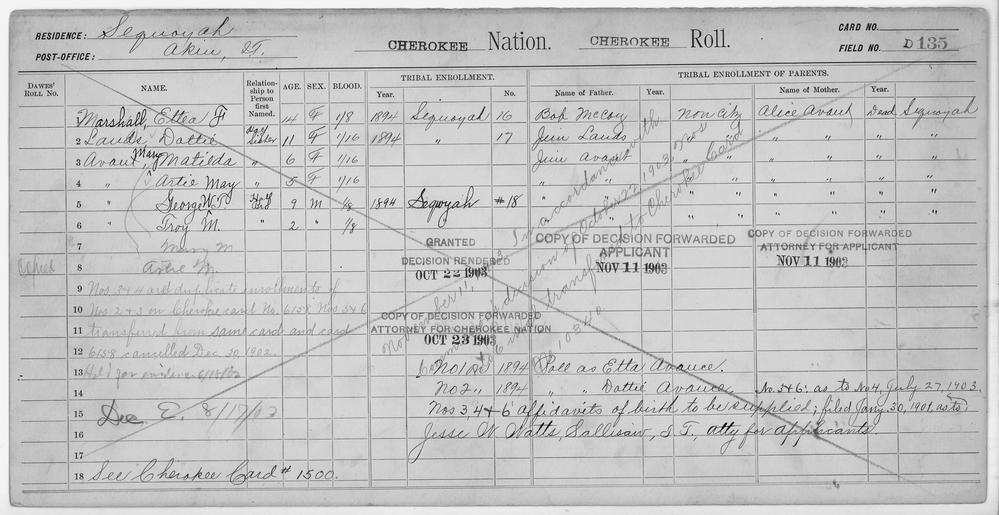 | Keywords: Enrollment for Cherokee Census Card D135 - NARA - 251883.tif Local identifier 75-53A-CHEROKEE D135 Department of the Interior Office of Indian Affairs Office of the Commissioner to the Five Civilized Tribes 1893 - 1914 NARA's Southwest Region Fort Worth NRFA 1400 John Burgess Drive Fort Worth TX 76140 Record group Record Group 75 Records of the Bureau of Indian Affairs 1793 - 1999 Record group ARC 404 Enrollment Cards compiled 1898 - 1914 Series ARC 251747 Variant control numbers NAIL Control Number NRFF-75-53A-11090<br /> NAIL Control Number NRFF-75-53A-11091<br /> NAIL Control Number NRFF-75-53A-12059<br /> NAIL Control Number NRFF-75-53A-12604<br /> NAIL Control Number NRFF-75-53A-738<br /> NAIL Control Number NRFF-75-53A-739<br /> NAIL Control Number NRFF-75-53A-740<br /> NAIL Control Number NRFF-75-53A-741<br /> NAIL Control Number NRFF-75-53A-742<br /> NAIL Control Number NRFF-75-53A-CHEROKEE D135 General notes Scope and content Name Alice Avaut Type Parent Sex Female Name Artie May Avaut Type Doubtful Age 5 Sex Female Degree Indian Blood 1/16 City of Residence Akin Name George Wt Avaut Type Doubtful Age 9 Sex Male Degree Indian Blood 1/8 City of Residence Akin Name Mary Matilda Avaut Type Doubtful Age 6 Sex Female Degree Indian Blood 1/16 City of Residence Akin Name Troyge M Avaut Type Doubtful Age 2 Sex Male Degree Indian Blood 1/8 City of Residence Akin Name Dottie Laudis Type Doubtful Age 11 Sex Female Degree Indian Blood 1/16 City of Residence Akin Name Jim Lauds Type Parent Sex Male Name Ettea F Marshall Type Doubtful Age 14 Sex Female Degree Indian Blood 1/8 City of Residence Akin Name Bob McCoy Type Parent Sex Male File unit File unit ARC yes <gallery> File Enrollment_for_Cherokee_Census_Card_D135_-_NARA_-_251883 tif tif File Enrollment_for_Cherokee_Census_Card_D135_-_NARA_-_251883 jpg jpg </gallery> NARA-cooperation PD-USGov Cherokee census cards NARA TIF images with categorized JPGs |