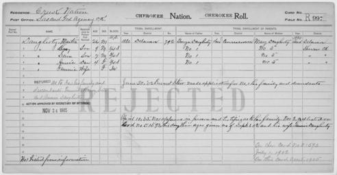 Keywords: Enrollment for Cherokee Census Card R997 - NARA - 260060.tif Scope and content Name Annie Daugherty Type Rejected Age 4 Sex Female Degree Indian Blood 3/4 City of Residence Sac Fox ok Name Fannie Daugherty Type Rejected Sex Female Degree Indian Blood Intermarried White City of Residence Sac Fox ok Name George Daugherty Type Parent Sex Male Name Harry Daugherty Type Rejected Age 9 Sex Male Degree Indian Blood 3/4 City of Residence Sac Fox ok Name Martin Daugherty Type Rejected Age 26 Sex Male Degree Indian Blood AS City of Residence Sac Fox ok Name Mary Daugherty Type Parent Sex Female Name Sam Daugherty Type Rejected Age 7 Sex Male Degree Indian Blood 3/4 City of Residence Sac Fox ok General notes 260060 Local identifier 75-53A-CHEROKEE R997 Department of the Interior Office of Indian Affairs Office of the Commissioner to the Five Civilized Tribes 1893 - 1914 NARA's Southwest Region Fort Worth NRFA 1400 John Burgess Drive Fort Worth TX 76140 Record group Record Group 75 Records of the Bureau of Indian Affairs 1793 - 1999 Record group ARC 404 Enrollment Cards compiled 1898 - 1914 Series ARC 251747 File unit File unit ARC Variant control numbers NAIL Control Number NRFF-75-53A-4964<br /> NAIL Control Number NRFF-75-53A-4974<br /> NAIL Control Number NRFF-75-53A-4975<br /> NAIL Control Number NRFF-75-53A-4976<br /> NAIL Control Number NRFF-75-53A-4987<br /> NAIL Control Number NRFF-75-53A-4989<br /> NAIL Control Number NRFF-75-53A-4995<br /> NAIL Control Number NRFF-75-53A-CHEROKEE R997 yes Other versions <gallery> File Enrollment_for_Cherokee_Census_Card_R997_-_NARA_-_260060 tif tif File Enrollment_for_Cherokee_Census_Card_R997_-_NARA_-_260060 jpg jpg </gallery> NARA-cooperation PD-USGov Cherokee census cards NARA TIF images with categorized JPGs |