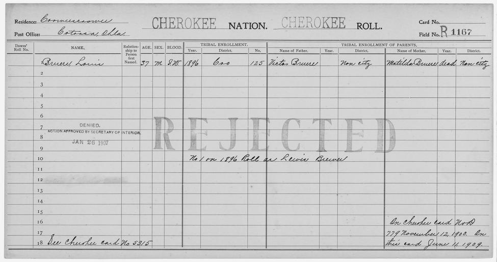 Keywords: Enrollment for Cherokee Census Card R1167 - NARA - 260230.tif Scope and content Name Louis Bruere Type Rejected Age 37 Sex Male Degree Indian Blood Intermarried White City of Residence Catoosa ok Name Matilda Bruere Type Parent Sex Female Name Victor Bruere Type Parent Sex Male General notes 260230 Local identifier 75-53A-CHEROKEE R1167 Department of the Interior Office of Indian Affairs Office of the Commissioner to the Five Civilized Tribes 1893 - 1914 NARA's Southwest Region Fort Worth NRFA 1400 John Burgess Drive Fort Worth TX 76140 Record group Record Group 75 Records of the Bureau of Indian Affairs 1793 - 1999 Record group ARC 404 Enrollment Cards compiled 1898 - 1914 Series ARC 251747 File unit File unit ARC Variant control numbers NAIL Control Number NRFF-75-53A-2639<br /> NAIL Control Number NRFF-75-53A-2640<br /> NAIL Control Number NRFF-75-53A-2641<br /> NAIL Control Number NRFF-75-53A-CHEROKEE R1167 yes Other versions <gallery> File Enrollment_for_Cherokee_Census_Card_R1167_-_NARA_-_260230 tif tif File Enrollment_for_Cherokee_Census_Card_R1167_-_NARA_-_260230 jpg jpg </gallery> NARA-cooperation PD-USGov Cherokee census cards NARA TIF images with categorized JPGs |