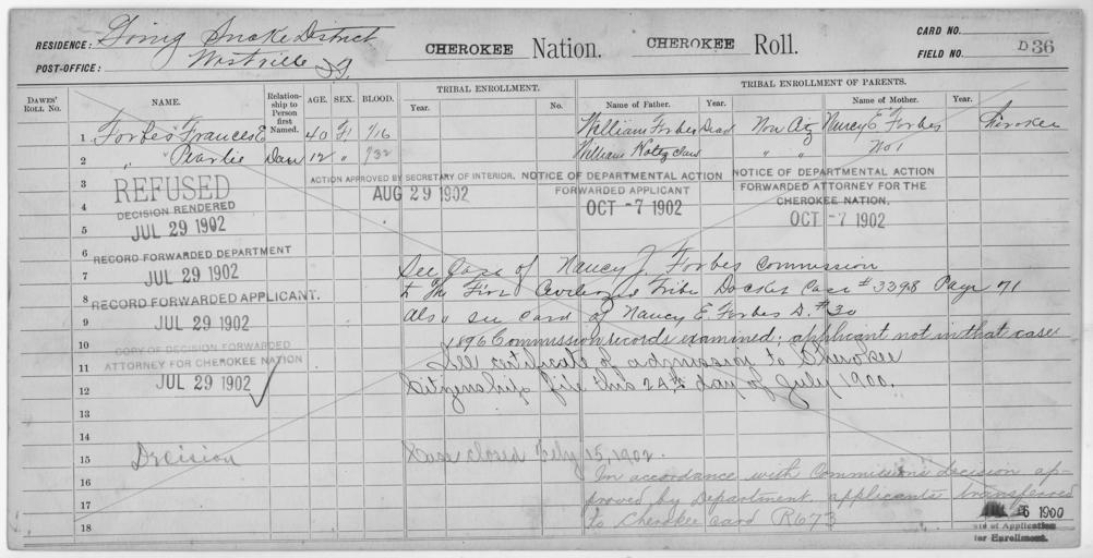 | Keywords: Enrollment for Cherokee Census Card D36 - NARA - 251784.jpg Scope and content Name Francis E Forbes Type Doubtful Age 40 Sex Female Degree Indian Blood 1/16 City of Residence Westville Name Nancy Forbes Type Parent Sex Female Name Pearlie Forbes Type Doubtful Age 12 Sex Female Degree Indian Blood 1/32 City of Residence Westville Name William Forbes Type Parent Sex Male Name William Hotezclaw Type Parent Sex Male General notes 251784 Local identifier 75-53A-CHEROKEE D36 Department of the Interior Office of Indian Affairs Office of the Commissioner to the Five Civilized Tribes 1893 - 1914 NARA's Southwest Region Fort Worth NRFA 1400 John Burgess Drive Fort Worth TX 76140 Record group Record Group 75 Records of the Bureau of Indian Affairs 1793 - 1999 Record group ARC 404 Enrollment Cards compiled 1898 - 1914 Series ARC 251747 File unit File unit ARC Variant control numbers NAIL Control Number NRFF-75-53A-6663<br /> NAIL Control Number NRFF-75-53A-6671<br /> NAIL Control Number NRFF-75-53A-6679<br /> NAIL Control Number NRFF-75-53A-6688<br /> NAIL Control Number NRFF-75-53A-9222<br /> NAIL Control Number NRFF-75-53A-CHEROKEE D36 Other versions <gallery> File Enrollment_for_Cherokee_Census_Card_D36_-_NARA_-_251784 tif tif File Enrollment_for_Cherokee_Census_Card_D36_-_NARA_-_251784 jpg jpg </gallery> NARA-cooperation PD-USGov Cherokee census cards |