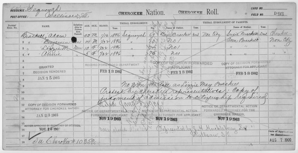 Keywords: Enrollment for Cherokee Census Card D93 - NARA - 251841.jpg Scope and content Name Adam Brackett Type Doubtful Age 55 Sex Male Degree Indian Blood 1/16 City of Residence Sallisaw Name Ann Brackett Type Parent Sex Female Name Annie Brackett Type Doubtful Age 5 Sex Female Degree Indian Blood 1/32 City of Residence Sallisaw Name Ben Brackett Type Parent Sex Male Name Benjamin Brackett Type Doubtful Age 14 Sex Male Degree Indian Blood 1/32 City of Residence Sallisaw Name Lizzie M Brackett Type Doubtful Age 10 Sex Female Degree Indian Blood 1/32 City of Residence Sallisaw Name Susie Brackett Type Parent Sex Female General notes 251841 Local identifier 75-53A-CHEROKEE D93 Department of the Interior Office of Indian Affairs Office of the Commissioner to the Five Civilized Tribes 1893 - 1914 NARA's Southwest Region Fort Worth NRFA 1400 John Burgess Drive Fort Worth TX 76140 Record group Record Group 75 Records of the Bureau of Indian Affairs 1793 - 1999 Record group ARC 404 Enrollment Cards compiled 1898 - 1914 Series ARC 251747 File unit File unit ARC Variant control numbers NAIL Control Number NRFF-75-53A-2127<br /> NAIL Control Number NRFF-75-53A-2129<br /> NAIL Control Number NRFF-75-53A-2130<br /> NAIL Control Number NRFF-75-53A-2134<br /> NAIL Control Number NRFF-75-53A-2137<br /> NAIL Control Number NRFF-75-53A-2145<br /> NAIL Control Number NRFF-75-53A-2164<br /> NAIL Control Number NRFF-75-53A-CHEROKEE D93 Other versions <gallery> File Enrollment_for_Cherokee_Census_Card_D93_-_NARA_-_251841 tif tif File Enrollment_for_Cherokee_Census_Card_D93_-_NARA_-_251841 jpg jpg </gallery> NARA-cooperation PD-USGov Cherokee census cards |