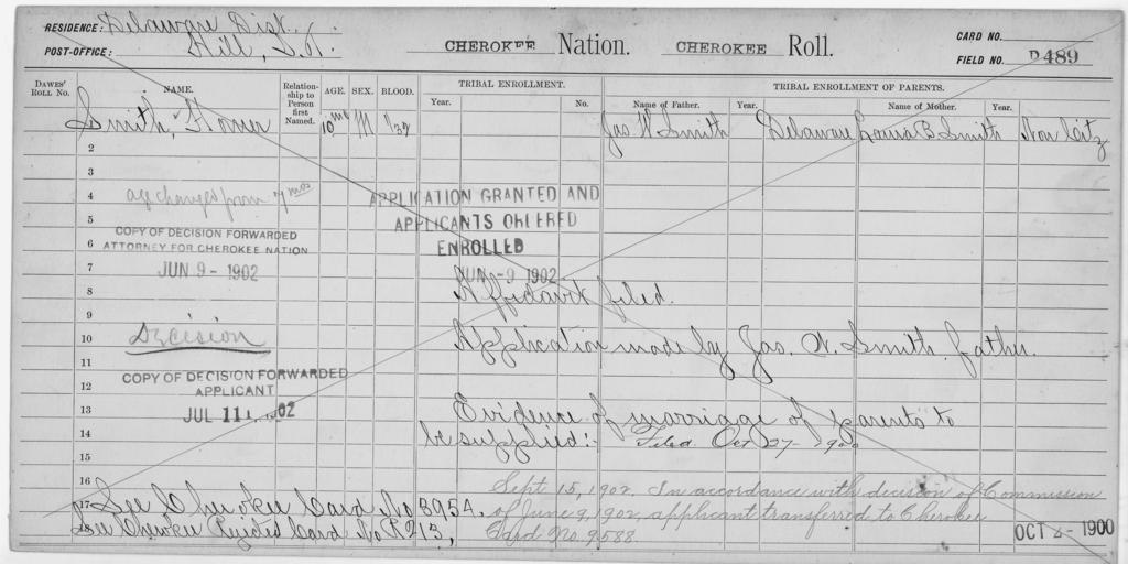 Keywords: Enrollment for Cherokee Census Card D489 - NARA - 252237.jpg Scope and content Name Homer Smith Type Doubtful Age 1 Sex Male Degree Indian Blood 1/32 Roll Number Not Reported Post Office Hill Name J W Smith Type Parent Age Not Reported Sex Male Degree Indian Blood Not Reported Roll Number Not Reported Post Office Not Reported Name Laura B Smith Type Parent Age Not Reported Sex Female Degree Indian Blood Not Reported Roll Number Not Reported Post Office Not Reported General notes 252237 Local identifier 75-53A-CHEROKEE D489 Department of the Interior Office of Indian Affairs Office of the Commissioner to the Five Civilized Tribes 1893 - 1914 NARA's Southwest Region Fort Worth NRFA 1400 John Burgess Drive Fort Worth TX 76140 Record group Record Group 75 Records of the Bureau of Indian Affairs 1793 - 1999 Record group ARC 404 Enrollment Cards compiled 1898 - 1914 Series ARC 251747 File unit File unit ARC Variant control numbers NAIL Control Number NRFF-75-53A-53839<br /> NAIL Control Number NRFF-75-53A-53840<br /> NAIL Control Number NRFF-75-53A-53841<br /> NAIL Control Number NRFF-75-53A-CHEROKEE D489 Other versions <gallery> File Enrollment_for_Cherokee_Census_Card_D489_-_NARA_-_252237 tif tif File Enrollment_for_Cherokee_Census_Card_D489_-_NARA_-_252237 jpg jpg </gallery> NARA-cooperation PD-USGov Cherokee census cards |