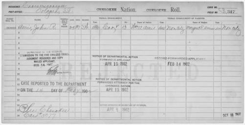 | Keywords: Enrollment for Cherokee Census Card R347 - NARA - 259410.jpg Scope and content Name John R Amis Type Rejected Age 39 Sex Male Degree Indian Blood Intermarried White City of Residence Oolagah Name Margaret R Amis Type Parent Sex Female Name William A Amis Type Parent Sex Male General notes 259410 Local identifier 75-53A-CHEROKEE R347 Department of the Interior Office of Indian Affairs Office of the Commissioner to the Five Civilized Tribes 1893 - 1914 NARA's Southwest Region Fort Worth NRFA 1400 John Burgess Drive Fort Worth TX 76140 Record group Record Group 75 Records of the Bureau of Indian Affairs 1793 - 1999 Record group ARC 404 Enrollment Cards compiled 1898 - 1914 Series ARC 251747 File unit File unit ARC Variant control numbers NAIL Control Number NRFF-75-53A-481<br /> NAIL Control Number NRFF-75-53A-482<br /> NAIL Control Number NRFF-75-53A-483<br /> NAIL Control Number NRFF-75-53A-CHEROKEE R347 Other versions <gallery> File Enrollment_for_Cherokee_Census_Card_R347_-_NARA_-_259410 tif tif File Enrollment_for_Cherokee_Census_Card_R347_-_NARA_-_259410 jpg jpg </gallery> NARA-cooperation PD-USGov Cherokee census cards |