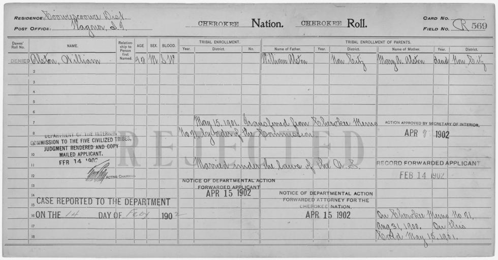 | Keywords: Enrollment for Cherokee Census Card R569 - NARA - 259632.jpg Scope and content Name Mary A Alston Type Parent Sex Female Name William Alston Type Rejected Age 42 Sex Male Degree Indian Blood Intermarried White City of Residence Wagonerejected Name William Alston Type Parent Sex Male General notes 259632 Local identifier 75-53A-CHEROKEE R569 Department of the Interior Office of Indian Affairs Office of the Commissioner to the Five Civilized Tribes 1893 - 1914 NARA's Southwest Region Fort Worth NRFA 1400 John Burgess Drive Fort Worth TX 76140 Record group Record Group 75 Records of the Bureau of Indian Affairs 1793 - 1999 Record group ARC 404 Enrollment Cards compiled 1898 - 1914 Series ARC 251747 File unit File unit ARC Variant control numbers NAIL Control Number NRFF-75-53A-474<br /> NAIL Control Number NRFF-75-53A-475<br /> NAIL Control Number NRFF-75-53A-476<br /> NAIL Control Number NRFF-75-53A-CHEROKEE R569 Other versions <gallery> File Enrollment_for_Cherokee_Census_Card_R569_-_NARA_-_259632 tif tif File Enrollment_for_Cherokee_Census_Card_R569_-_NARA_-_259632 jpg jpg </gallery> NARA-cooperation PD-USGov Cherokee census cards |