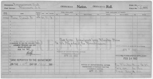 | Keywords: Enrollment for Cherokee Census Card R601 - NARA - 259664.jpg Scope and content Name Daniel C Moore Type Rejected Age 39 Sex Male Degree Indian Blood 1/8 City of Residence Claremore General notes 259664 Local identifier 75-53A-CHEROKEE R601 Department of the Interior Office of Indian Affairs Office of the Commissioner to the Five Civilized Tribes 1893 - 1914 NARA's Southwest Region Fort Worth NRFA 1400 John Burgess Drive Fort Worth TX 76140 Record group Record Group 75 Records of the Bureau of Indian Affairs 1793 - 1999 Record group ARC 404 Enrollment Cards compiled 1898 - 1914 Series ARC 251747 File unit File unit ARC Variant control numbers NAIL Control Number NRFF-75-53A-13337<br /> NAIL Control Number NRFF-75-53A-CHEROKEE R601 Other versions <gallery> File Enrollment_for_Cherokee_Census_Card_R601_-_NARA_-_259664 tif tif File Enrollment_for_Cherokee_Census_Card_R601_-_NARA_-_259664 jpg jpg </gallery> NARA-cooperation PD-USGov Cherokee census cards |