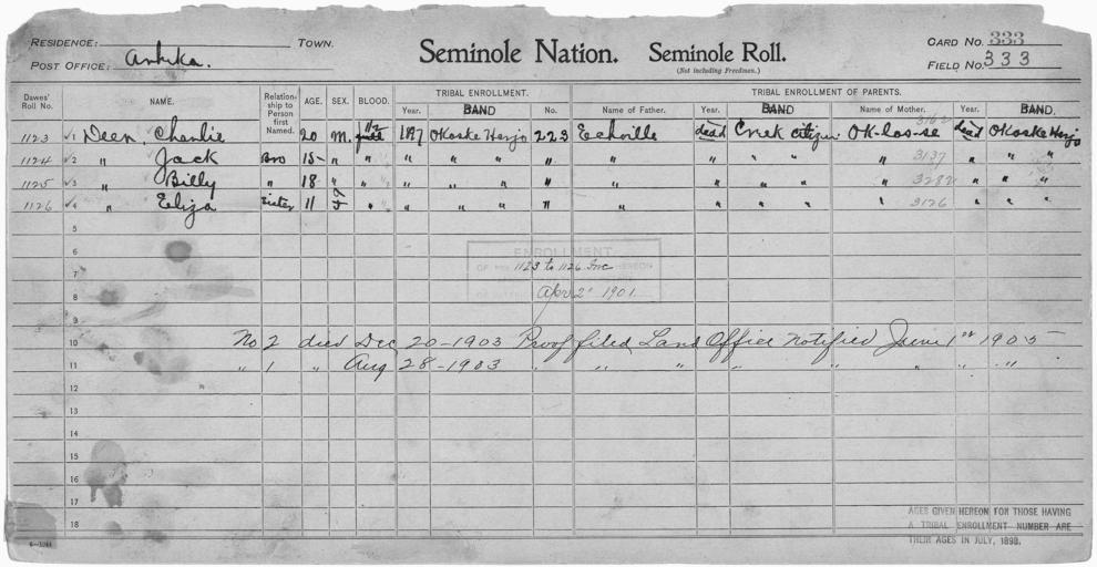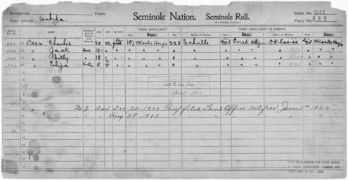 Keywords: Enrollment for Seminole Census Card 333 - NARA - 267907.jpg Scope and content Name Billy Deer Type By Blood Age 18 Sex Male Degree Indian Blood 1/2 Roll Number 1125 City of Residence oh Name Charlie Deer Type By Blood Age 20 Sex Male Degree Indian Blood 1/2 Roll Number 1123 City of Residence oh Name Eliza Deer Type By Blood Age 11 Sex Female Degree Indian Blood 1/2 Roll Number 1126 City of Residence oh Name Jack Deer Type By Blood Age 15 Sex Male Degree Indian Blood 1/2 Roll Number 1124 City of Residence oh Name Echoille Type Parent Sex Male City of Residence Creek Name Oklasse Type Parent Sex Female City of Residence oh General notes 267907 Local identifier 75-53A-SEMINOLE 333 Department of the Interior Office of Indian Affairs Office of the Commissioner to the Five Civilized Tribes 1893 - 1914 NARA's Southwest Region Fort Worth NRFA 1400 John Burgess Drive Fort Worth TX 76140 Record group Record Group 75 Records of the Bureau of Indian Affairs 1793 - 1999 Record group ARC 404 Enrollment Cards compiled 1898 - 1914 Series ARC 251747 File unit File unit ARC Variant control numbers NAIL Control Number NRFF-75-53A-30065<br /> NAIL Control Number NRFF-75-53A-30069<br /> NAIL Control Number NRFF-75-53A-30081<br /> NAIL Control Number NRFF-75-53A-30095<br /> NAIL Control Number NRFF-75-53A-30762<br /> NAIL Control Number NRFF-75-53A-43392<br /> NAIL Control Number NRFF-75-53A-SEMINOLE 333 Other versions <gallery> File Enrollment_for_Seminole_Census_Card_333_-_NARA_-_267907 tif tif File Enrollment_for_Seminole_Census_Card_333_-_NARA_-_267907 jpg jpg </gallery> NARA-cooperation PD-USGov Seminole census cards |