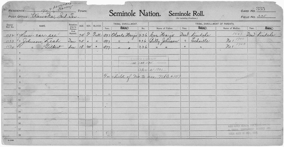 Keywords: Enrollment for Seminole Census Card 335 - NARA - 267909.tif Scope and content Name Coe Harjo Type Parent Sex Male City of Residence k Name Billy Johnson Type Parent Sex Male City of Residence e Name Gilbert Johnson Type By Blood Age 18 Sex Male Degree Indian Blood Full Roll Number 1134 City of Residence oh Name Leah Johnson Type By Blood Age 25 Sex Female Degree Indian Blood Full Roll Number 1133 City of Residence oh Name Succarsee Type By Blood Age 74 Sex Female Degree Indian Blood Full Roll Number 1132 City of Residence oh General notes 267909 Local identifier 75-53A-SEMINOLE 335 Department of the Interior Office of Indian Affairs Office of the Commissioner to the Five Civilized Tribes 1893 - 1914 NARA's Southwest Region Fort Worth NRFA 1400 John Burgess Drive Fort Worth TX 76140 Record group Record Group 75 Records of the Bureau of Indian Affairs 1793 - 1999 Record group ARC 404 Enrollment Cards compiled 1898 - 1914 Series ARC 251747 File unit File unit ARC Variant control numbers NAIL Control Number NRFF-75-53A-34222<br /> NAIL Control Number NRFF-75-53A-37732<br /> NAIL Control Number NRFF-75-53A-37817<br /> NAIL Control Number NRFF-75-53A-37867<br /> NAIL Control Number NRFF-75-53A-48165<br /> NAIL Control Number NRFF-75-53A-SEMINOLE 335 yes Other versions <gallery> File Enrollment_for_Seminole_Census_Card_335_-_NARA_-_267909 tif tif File Enrollment_for_Seminole_Census_Card_335_-_NARA_-_267909 jpg jpg </gallery> NARA-cooperation PD-USGov Seminole census cards NARA TIF images with categorized JPGs |