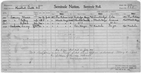 | Keywords: Enrollment for Seminole Census Card 338 - NARA - 267912.tif Scope and content Name Lucy Archockee Type By Blood Age 46 Sex Female Degree Indian Blood Full Roll Number 1143 City of Residence oh Name Aharlock Emarther Type Parent Sex Male City of Residence oh Name Coe Harjo Type Parent Sex Male City of Residence k Name Hodulga Harjo Type Parent Sex Male City of Residence th Name Betsy Larney Type By Blood Age 28 Sex Female Degree Indian Blood Full Roll Number 1142 City of Residence oh Name Mose Larney Type By Blood Age 25 Sex Male Degree Indian Blood Full Roll Number 1141 City of Residence tp Name Siber Larney Type By Blood Age 1 Sex Female Degree Indian Blood Full City of Residence oh Name Leana Type Parent Sex Female City of Residence oh Name Lila Type Parent Sex Female City of Residence tp Name Toga Type Parent Sex Female City of Residence k General notes 267912 Local identifier 75-53A-SEMINOLE 338 Department of the Interior Office of Indian Affairs Office of the Commissioner to the Five Civilized Tribes 1893 - 1914 NARA's Southwest Region Fort Worth NRFA 1400 John Burgess Drive Fort Worth TX 76140 Record group Record Group 75 Records of the Bureau of Indian Affairs 1793 - 1999 Record group ARC 404 Enrollment Cards compiled 1898 - 1914 Series ARC 251747 File unit File unit ARC Variant control numbers NAIL Control Number NRFF-75-53A-23343<br /> NAIL Control Number NRFF-75-53A-30872<br /> NAIL Control Number NRFF-75-53A-34223<br /> NAIL Control Number NRFF-75-53A-34409<br /> NAIL Control Number NRFF-75-53A-38981<br /> NAIL Control Number NRFF-75-53A-39047<br /> NAIL Control Number NRFF-75-53A-39061<br /> NAIL Control Number NRFF-75-53A-39216<br /> NAIL Control Number NRFF-75-53A-39477<br /> NAIL Control Number NRFF-75-53A-49985<br /> NAIL Control Number NRFF-75-53A-SEMINOLE 338 yes Other versions <gallery> File Enrollment_for_Seminole_Census_Card_338_-_NARA_-_267912 tif tif File Enrollment_for_Seminole_Census_Card_338_-_NARA_-_267912 jpg jpg </gallery> NARA-cooperation PD-USGov Seminole census cards NARA TIF images with categorized JPGs |