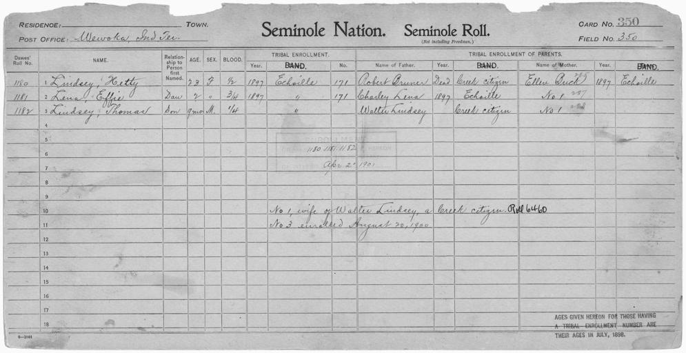 | Keywords: Enrollment for Seminole Census Card 350 - NARA - 267924.jpg Scope and content Name Robert Bruner Type Parent Sex Male City of Residence Creek Name Ellen Buck Type Parent Sex Female City of Residence e Name Charley Lena Type Parent Sex Male City of Residence e Name Effie Lena Type By Blood Age 2 Sex Female Degree Indian Blood 3/4 Roll Number 1181 City of Residence e Name Hetty Lindsey Type By Blood Age 23 Sex Female Degree Indian Blood 1/2 Roll Number 1180 City of Residence e Name Thomas Lindsey Type By Blood Age 1 Sex Male Degree Indian Blood 1/4 Roll Number 1182 City of Residence e Name Walter Lindsey Type Parent Sex Male City of Residence Creek General notes 267924 Local identifier 75-53A-SEMINOLE 350 Department of the Interior Office of Indian Affairs Office of the Commissioner to the Five Civilized Tribes 1893 - 1914 NARA's Southwest Region Fort Worth NRFA 1400 John Burgess Drive Fort Worth TX 76140 Record group Record Group 75 Records of the Bureau of Indian Affairs 1793 - 1999 Record group ARC 404 Enrollment Cards compiled 1898 - 1914 Series ARC 251747 File unit File unit ARC Variant control numbers NAIL Control Number NRFF-75-53A-26389<br /> NAIL Control Number NRFF-75-53A-26486<br /> NAIL Control Number NRFF-75-53A-39280<br /> NAIL Control Number NRFF-75-53A-39282<br /> NAIL Control Number NRFF-75-53A-39536<br /> NAIL Control Number NRFF-75-53A-39553<br /> NAIL Control Number NRFF-75-53A-39558<br /> NAIL Control Number NRFF-75-53A-SEMINOLE 350 Other versions <gallery> File Enrollment_for_Seminole_Census_Card_350_-_NARA_-_267924 tif tif File Enrollment_for_Seminole_Census_Card_350_-_NARA_-_267924 jpg jpg </gallery> NARA-cooperation PD-USGov Seminole census cards |