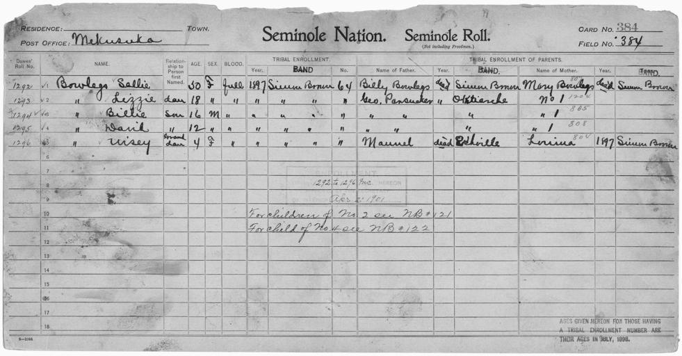 Keywords: Enrollment for Seminole Census Card 384 - NARA - 267958.jpg Scope and content Name Billie Bowlegs Type By Blood Age 16 Sex Male Degree Indian Blood Full Roll Number 1294 City of Residence sb Name Billy Bowlegs Type Parent Sex Male City of Residence sb Name David Bowlegs Type By Blood Age 12 Sex Male Degree Indian Blood Full Roll Number 1295 City of Residence sb Name Lizzie Bowlegs Type By Blood Age 18 Sex Female Degree Indian Blood Full Roll Number 1293 City of Residence sb Name Mary Bowlegs Type Parent Sex Female City of Residence sb Name Sallie Bowlegs Type By Blood Age 50 Sex Female Degree Indian Blood Full Roll Number 1292 City of Residence sb Name Wisey Bowlegs Type By Blood Age 4 Sex Female Degree Indian Blood Full Roll Number 1296 City of Residence sb Name George Pansucker Type Parent Sex Male City of Residence o General notes 267958 Local identifier 75-53A-SEMINOLE 384 Department of the Interior Office of Indian Affairs Office of the Commissioner to the Five Civilized Tribes 1893 - 1914 NARA's Southwest Region Fort Worth NRFA 1400 John Burgess Drive Fort Worth TX 76140 Record group Record Group 75 Records of the Bureau of Indian Affairs 1793 - 1999 Record group ARC 404 Enrollment Cards compiled 1898 - 1914 Series ARC 251747 File unit File unit ARC Variant control numbers NAIL Control Number NRFF-75-53A-25371<br /> NAIL Control Number NRFF-75-53A-25372<br /> NAIL Control Number NRFF-75-53A-25418<br /> NAIL Control Number NRFF-75-53A-25493<br /> NAIL Control Number NRFF-75-53A-25505<br /> NAIL Control Number NRFF-75-53A-25522<br /> NAIL Control Number NRFF-75-53A-25538<br /> NAIL Control Number NRFF-75-53A-43553<br /> NAIL Control Number NRFF-75-53A-SEMINOLE 384 Other versions <gallery> File Enrollment_for_Seminole_Census_Card_384_-_NARA_-_267958 tif tif File Enrollment_for_Seminole_Census_Card_384_-_NARA_-_267958 jpg jpg </gallery> NARA-cooperation PD-USGov Seminole census cards |