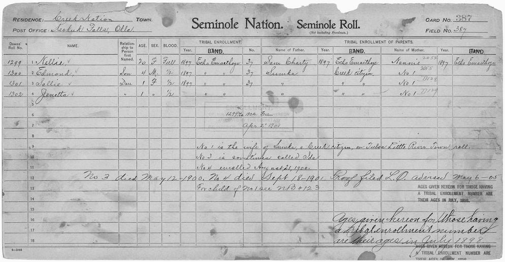 Keywords: Enrollment for Seminole Census Card 387 - NARA - 267961.tif Scope and content Name Sam Charty Type Parent Sex Male City of Residence ee Name Edmond Type By Blood Age 4 Sex Male Degree Indian Blood 1/2 Roll Number 1300 City of Residence ee Name Jenetta Type By Blood Age 1 Sex Female Degree Indian Blood 1/2 Roll Number 1302 City of Residence ee Name Nannie Type Parent Sex Female City of Residence ee Name Nellie Type By Blood Age 20 Sex Female Degree Indian Blood Full Roll Number 1299 City of Residence ee Name Sallie Type By Blood Age 1 Sex Female Degree Indian Blood 1/2 Roll Number 1301 City of Residence ee Name Sumka Type Parent Sex Male City of Residence Creek General notes 267961 Local identifier 75-53A-SEMINOLE 387 Department of the Interior Office of Indian Affairs Office of the Commissioner to the Five Civilized Tribes 1893 - 1914 NARA's Southwest Region Fort Worth NRFA 1400 John Burgess Drive Fort Worth TX 76140 Record group Record Group 75 Records of the Bureau of Indian Affairs 1793 - 1999 Record group ARC 404 Enrollment Cards compiled 1898 - 1914 Series ARC 251747 File unit File unit ARC Variant control numbers NAIL Control Number NRFF-75-53A-27511<br /> NAIL Control Number NRFF-75-53A-30774<br /> NAIL Control Number NRFF-75-53A-37532<br /> NAIL Control Number NRFF-75-53A-42952<br /> NAIL Control Number NRFF-75-53A-43042<br /> NAIL Control Number NRFF-75-53A-45623<br /> NAIL Control Number NRFF-75-53A-48331<br /> NAIL Control Number NRFF-75-53A-SEMINOLE 387 yes Other versions <gallery> File Enrollment_for_Seminole_Census_Card_387_-_NARA_-_267961 tif tif File Enrollment_for_Seminole_Census_Card_387_-_NARA_-_267961 jpg jpg </gallery> NARA-cooperation PD-USGov Seminole census cards NARA TIF images with categorized JPGs |