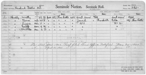 | Keywords: Enrollment for Seminole Census Card 395 - NARA - 267969.jpg Scope and content Name Esop Hully Type By Blood Age 4 Sex Male Degree Indian Blood Full Roll Number 1328 City of Residence tl Name Lizzie Hully Type By Blood Age 8 Sex Female Degree Indian Blood Full Roll Number 1327 City of Residence tl Name Mitta Hully Type By Blood Age 12 Sex Female Degree Indian Blood Full Roll Number 1329 City of Residence tl Name Nora Hully Type By Blood Age 28 Sex Female Degree Indian Blood Full Roll Number 1326 City of Residence tl Name Watty Hully Type By Blood Age 37 Sex Male Degree Indian Blood Full Roll Number 1325 City of Residence tl General notes 267969 Local identifier 75-53A-SEMINOLE 395 Department of the Interior Office of Indian Affairs Office of the Commissioner to the Five Civilized Tribes 1893 - 1914 NARA's Southwest Region Fort Worth NRFA 1400 John Burgess Drive Fort Worth TX 76140 Record group Record Group 75 Records of the Bureau of Indian Affairs 1793 - 1999 Record group ARC 404 Enrollment Cards compiled 1898 - 1914 Series ARC 251747 File unit File unit ARC Variant control numbers NAIL Control Number NRFF-75-53A-36908<br /> NAIL Control Number NRFF-75-53A-36913<br /> NAIL Control Number NRFF-75-53A-36915<br /> NAIL Control Number NRFF-75-53A-36916<br /> NAIL Control Number NRFF-75-53A-36920<br /> NAIL Control Number NRFF-75-53A-SEMINOLE 395 Other versions <gallery> File Enrollment_for_Seminole_Census_Card_395_-_NARA_-_267969 tif tif File Enrollment_for_Seminole_Census_Card_395_-_NARA_-_267969 jpg jpg </gallery> NARA-cooperation PD-USGov Seminole census cards |