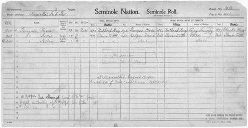 Keywords: Enrollment for Seminole Census Card 403 - NARA - 267977.tif Scope and content Name Chepon Davis Type Parent Sex Male City of Residence tl Name Folee Type Parent Sex Female City of Residence tl Name Lucy Larney Type Parent Sex Female City of Residence oh Name Nelia Tanyan Type By Blood Age 1 Sex Male Degree Indian Blood Full Roll Number 1344 City of Residence tl Name Nina Tanyan Type By Blood Age 23 Sex Male Degree Indian Blood Full Roll Number 1342 City of Residence nh Name Sallie Tanyan Type By Blood Age 19 Sex Female Degree Indian Blood Full Roll Number 1343 City of Residence tl Name Tanyan Woxa Type Parent Sex Male City of Residence nh General notes 267977 Local identifier 75-53A-SEMINOLE 403 Department of the Interior Office of Indian Affairs Office of the Commissioner to the Five Civilized Tribes 1893 - 1914 NARA's Southwest Region Fort Worth NRFA 1400 John Burgess Drive Fort Worth TX 76140 Record group Record Group 75 Records of the Bureau of Indian Affairs 1793 - 1999 Record group ARC 404 Enrollment Cards compiled 1898 - 1914 Series ARC 251747 File unit File unit ARC Variant control numbers NAIL Control Number NRFF-75-53A-29612<br /> NAIL Control Number NRFF-75-53A-32206<br /> NAIL Control Number NRFF-75-53A-39031<br /> NAIL Control Number NRFF-75-53A-48555<br /> NAIL Control Number NRFF-75-53A-48556<br /> NAIL Control Number NRFF-75-53A-48557<br /> NAIL Control Number NRFF-75-53A-51972<br /> NAIL Control Number NRFF-75-53A-SEMINOLE 403 yes Other versions <gallery> File Enrollment_for_Seminole_Census_Card_403_-_NARA_-_267977 tif tif File Enrollment_for_Seminole_Census_Card_403_-_NARA_-_267977 jpg jpg </gallery> NARA-cooperation PD-USGov Seminole census cards NARA TIF images with categorized JPGs |