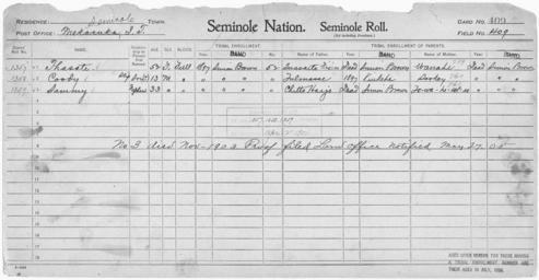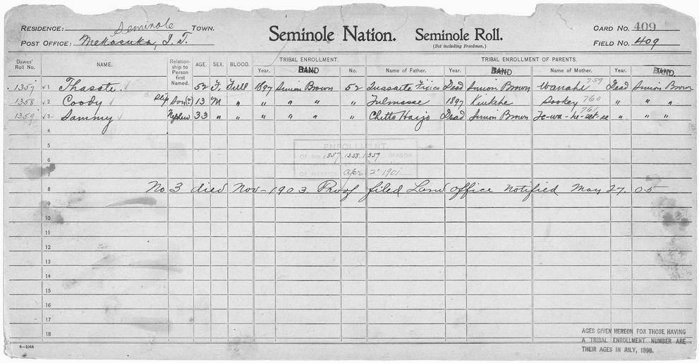 Keywords: Enrollment for Seminole Census Card 409 - NARA - 267983.tif Scope and content Name Coody Type By Blood Age 13 Sex Male Degree Indian Blood Full Roll Number 1358 City of Residence sb Name Quasarte Fixico Type Parent Sex Male City of Residence sb Name Chitto Harjo Type Parent Sex Male City of Residence sb Name Sammy Type By Blood Age 33 Sex Male Degree Indian Blood Full Roll Number 1359 City of Residence sb Name Sookey Type Parent Sex Female City of Residence sb Name Tewahesetse Type Parent Sex Female City of Residence sb Name Thasate Type By Blood Age 52 Sex Female Degree Indian Blood Full Roll Number 1357 City of Residence sb Name Tulmasse Type Parent Sex Male City of Residence k Name Wanahe Type Parent Sex Female City of Residence sb General notes 267983 Local identifier 75-53A-SEMINOLE 409 Department of the Interior Office of Indian Affairs Office of the Commissioner to the Five Civilized Tribes 1893 - 1914 NARA's Southwest Region Fort Worth NRFA 1400 John Burgess Drive Fort Worth TX 76140 Record group Record Group 75 Records of the Bureau of Indian Affairs 1793 - 1999 Record group ARC 404 Enrollment Cards compiled 1898 - 1914 Series ARC 251747 File unit File unit ARC Variant control numbers NAIL Control Number NRFF-75-53A-28734<br /> NAIL Control Number NRFF-75-53A-32058<br /> NAIL Control Number NRFF-75-53A-34192<br /> NAIL Control Number NRFF-75-53A-45660<br /> NAIL Control Number NRFF-75-53A-47640<br /> NAIL Control Number NRFF-75-53A-48907<br /> NAIL Control Number NRFF-75-53A-48936<br /> NAIL Control Number NRFF-75-53A-50122<br /> NAIL Control Number NRFF-75-53A-50583<br /> NAIL Control Number NRFF-75-53A-SEMINOLE 409 yes Other versions <gallery> File Enrollment_for_Seminole_Census_Card_409_-_NARA_-_267983 tif tif File Enrollment_for_Seminole_Census_Card_409_-_NARA_-_267983 jpg jpg </gallery> NARA-cooperation PD-USGov Seminole census cards NARA TIF images with categorized JPGs |