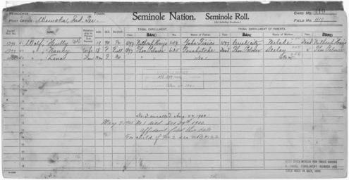 Keywords: Enrollment for Seminole Census Card 419 - NARA - 267993.tif Scope and content Name Yaha Fixico Type Parent Sex Male City of Residence Creek Name Foushutche Type Parent Sex Male City of Residence tp Name Melake Type Parent Sex Female City of Residence nh Name Seeley Type Parent Sex Female City of Residence tp Name Hully Wolf Type By Blood Age 19 Sex Male Degree Indian Blood 1/2 Roll Number 1398 City of Residence nh Name Lena Wolf Type By Blood Age 1 Sex Female Degree Indian Blood 3/4 Roll Number 1400 City of Residence tp Name Nancy Wolf Type By Blood Age 18 Sex Female Degree Indian Blood Full Roll Number 1399 City of Residence tp General notes 267993 Local identifier 75-53A-SEMINOLE 419 Department of the Interior Office of Indian Affairs Office of the Commissioner to the Five Civilized Tribes 1893 - 1914 NARA's Southwest Region Fort Worth NRFA 1400 John Burgess Drive Fort Worth TX 76140 Record group Record Group 75 Records of the Bureau of Indian Affairs 1793 - 1999 Record group ARC 404 Enrollment Cards compiled 1898 - 1914 Series ARC 251747 File unit File unit ARC Variant control numbers NAIL Control Number NRFF-75-53A-32140<br /> NAIL Control Number NRFF-75-53A-32406<br /> NAIL Control Number NRFF-75-53A-41760<br /> NAIL Control Number NRFF-75-53A-46432<br /> NAIL Control Number NRFF-75-53A-51837<br /> NAIL Control Number NRFF-75-53A-51862<br /> NAIL Control Number NRFF-75-53A-51880<br /> NAIL Control Number NRFF-75-53A-SEMINOLE 419 yes Other versions <gallery> File Enrollment_for_Seminole_Census_Card_419_-_NARA_-_267993 tif tif File Enrollment_for_Seminole_Census_Card_419_-_NARA_-_267993 jpg jpg </gallery> NARA-cooperation PD-USGov Seminole census cards NARA TIF images with categorized JPGs |