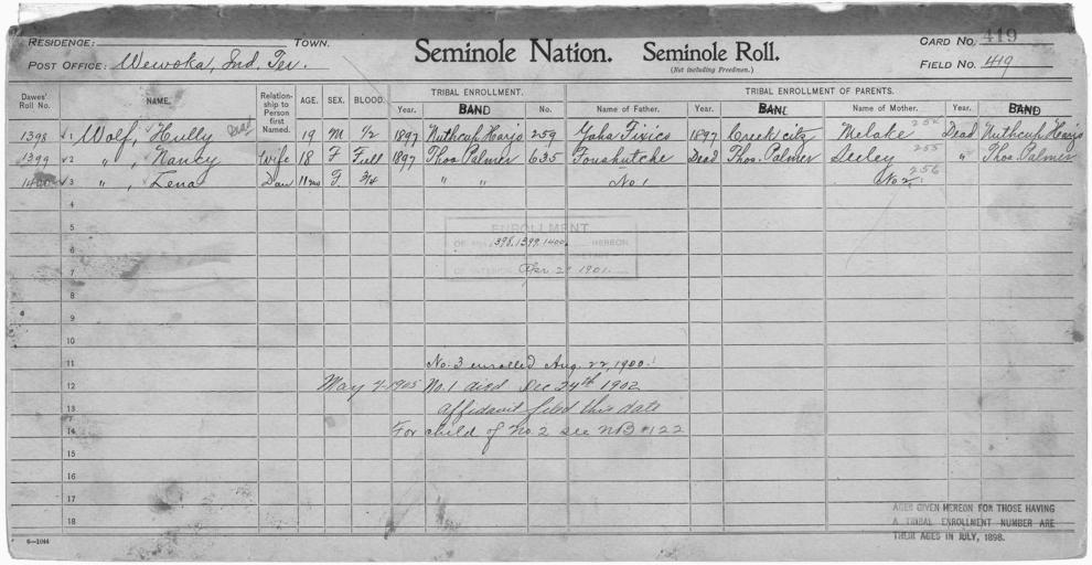 Keywords: Enrollment for Seminole Census Card 419 - NARA - 267993.jpg Scope and content Name Yaha Fixico Type Parent Sex Male City of Residence Creek Name Foushutche Type Parent Sex Male City of Residence tp Name Melake Type Parent Sex Female City of Residence nh Name Seeley Type Parent Sex Female City of Residence tp Name Hully Wolf Type By Blood Age 19 Sex Male Degree Indian Blood 1/2 Roll Number 1398 City of Residence nh Name Lena Wolf Type By Blood Age 1 Sex Female Degree Indian Blood 3/4 Roll Number 1400 City of Residence tp Name Nancy Wolf Type By Blood Age 18 Sex Female Degree Indian Blood Full Roll Number 1399 City of Residence tp General notes 267993 Local identifier 75-53A-SEMINOLE 419 Department of the Interior Office of Indian Affairs Office of the Commissioner to the Five Civilized Tribes 1893 - 1914 NARA's Southwest Region Fort Worth NRFA 1400 John Burgess Drive Fort Worth TX 76140 Record group Record Group 75 Records of the Bureau of Indian Affairs 1793 - 1999 Record group ARC 404 Enrollment Cards compiled 1898 - 1914 Series ARC 251747 File unit File unit ARC Variant control numbers NAIL Control Number NRFF-75-53A-32140<br /> NAIL Control Number NRFF-75-53A-32406<br /> NAIL Control Number NRFF-75-53A-41760<br /> NAIL Control Number NRFF-75-53A-46432<br /> NAIL Control Number NRFF-75-53A-51837<br /> NAIL Control Number NRFF-75-53A-51862<br /> NAIL Control Number NRFF-75-53A-51880<br /> NAIL Control Number NRFF-75-53A-SEMINOLE 419 Other versions <gallery> File Enrollment_for_Seminole_Census_Card_419_-_NARA_-_267993 tif tif File Enrollment_for_Seminole_Census_Card_419_-_NARA_-_267993 jpg jpg </gallery> NARA-cooperation PD-USGov Seminole census cards |
