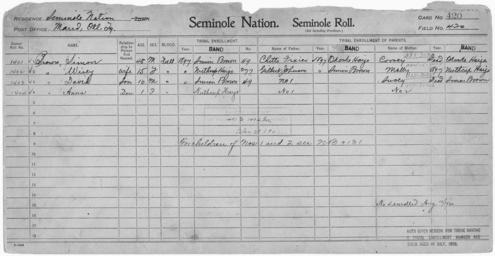 Keywords: Enrollment for Seminole Census Card 420 - NARA - 267994.tif Scope and content Name Anna Brown Type By Blood Age 1 Sex Female Degree Indian Blood Full Roll Number 1404 City of Residence nh Name David Brown Type By Blood Age 10 Sex Male Degree Indian Blood Full Roll Number 1403 City of Residence sb Name Simon Brown Type By Blood Age 45 Sex Male Degree Indian Blood Full Roll Number 1401 City of Residence sb Name Wisey Brown Type By Blood Age 15 Sex Female Degree Indian Blood Full Roll Number 1402 City of Residence nh Name Corsey Type Parent Sex Female City of Residence oh Name Chitto Fixico Type Parent Sex Male City of Residence oh Name Gilbert Johnson Type Parent Sex Male City of Residence sb Name Molly Type Parent Sex Female City of Residence sb General notes 267994 Local identifier 75-53A-SEMINOLE 420 Department of the Interior Office of Indian Affairs Office of the Commissioner to the Five Civilized Tribes 1893 - 1914 NARA's Southwest Region Fort Worth NRFA 1400 John Burgess Drive Fort Worth TX 76140 Record group Record Group 75 Records of the Bureau of Indian Affairs 1793 - 1999 Record group ARC 404 Enrollment Cards compiled 1898 - 1914 Series ARC 251747 File unit File unit ARC Variant control numbers NAIL Control Number NRFF-75-53A-25677<br /> NAIL Control Number NRFF-75-53A-25722<br /> NAIL Control Number NRFF-75-53A-25956<br /> NAIL Control Number NRFF-75-53A-25990<br /> NAIL Control Number NRFF-75-53A-28902<br /> NAIL Control Number NRFF-75-53A-31838<br /> NAIL Control Number NRFF-75-53A-37819<br /> NAIL Control Number NRFF-75-53A-42390<br /> NAIL Control Number NRFF-75-53A-SEMINOLE 420 yes Other versions <gallery> File Enrollment_for_Seminole_Census_Card_420_-_NARA_-_267994 tif tif File Enrollment_for_Seminole_Census_Card_420_-_NARA_-_267994 jpg jpg </gallery> NARA-cooperation PD-USGov Seminole census cards NARA TIF images with categorized JPGs |