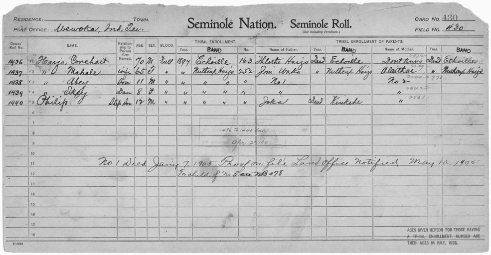 | Keywords: Enrollment for Seminole Census Card 430 - NARA - 268004.jpg Scope and content Name Alaithae Type Parent Sex Female City of Residence nh Name Abey Harjo Type By Blood Age 11 Sex Male Degree Indian Blood Full Roll Number 1438 City of Residence nh Name Conchart Harjo Type By Blood Age 70 Sex Male Degree Indian Blood Full Roll Number 1436 City of Residence e Name Ikey Harjo Type By Blood Age 8 Sex Female Degree Indian Blood Full Roll Number 1439 City of Residence nh Name Mahale Harjo Type By Blood Age 65 Sex Female Degree Indian Blood Full Roll Number 1437 City of Residence nh Name Thlothe Harjo Type Parent Sex Male City of Residence e Name Ioka Type Parent Sex Male City of Residence k Name Philip Type Parent Age 12 Sex Male Degree Indian Blood Full Roll Number 1440 City of Residence nh Name Jim Waka Type Parent Sex Male City of Residence nh General notes 268004 Local identifier 75-53A-SEMINOLE 430 Department of the Interior Office of Indian Affairs Office of the Commissioner to the Five Civilized Tribes 1893 - 1914 NARA's Southwest Region Fort Worth NRFA 1400 John Burgess Drive Fort Worth TX 76140 Record group Record Group 75 Records of the Bureau of Indian Affairs 1793 - 1999 Record group ARC 404 Enrollment Cards compiled 1898 - 1914 Series ARC 251747 File unit File unit ARC Variant control numbers NAIL Control Number NRFF-75-53A-22895<br /> NAIL Control Number NRFF-75-53A-34024<br /> NAIL Control Number NRFF-75-53A-34232<br /> NAIL Control Number NRFF-75-53A-34431<br /> NAIL Control Number NRFF-75-53A-34683<br /> NAIL Control Number NRFF-75-53A-35135<br /> NAIL Control Number NRFF-75-53A-37088<br /> NAIL Control Number NRFF-75-53A-44059<br /> NAIL Control Number NRFF-75-53A-50433<br /> NAIL Control Number NRFF-75-53A-SEMINOLE 430 Other versions <gallery> File Enrollment_for_Seminole_Census_Card_430_-_NARA_-_268004 tif tif File Enrollment_for_Seminole_Census_Card_430_-_NARA_-_268004 jpg jpg </gallery> NARA-cooperation PD-USGov Seminole census cards |