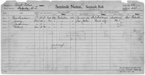 | Keywords: Enrollment for Seminole Census Card 431 - NARA - 268005.tif Scope and content Name Albert Type By Blood Age 5 Sex Male Degree Indian Blood 1/2 Roll Number 1444 City of Residence e Name Conhecha Type By Blood Age 40 Sex Female Degree Indian Blood Full Roll Number 1441 City of Residence e Name Cowoge Type Parent Sex Male Name Janey Type By Blood Age 14 Sex Female Degree Indian Blood 1/2 Roll Number 1442 City of Residence e Name Jemima Type By Blood Age 11 Sex Female Degree Indian Blood 1/2 Roll Number 1443 City of Residence e Name Jim Yaba Type Parent Sex Male City of Residence Creek General notes 268005 Local identifier 75-53A-SEMINOLE 431 Department of the Interior Office of Indian Affairs Office of the Commissioner to the Five Civilized Tribes 1893 - 1914 NARA's Southwest Region Fort Worth NRFA 1400 John Burgess Drive Fort Worth TX 76140 Record group Record Group 75 Records of the Bureau of Indian Affairs 1793 - 1999 Record group ARC 404 Enrollment Cards compiled 1898 - 1914 Series ARC 251747 File unit File unit ARC Variant control numbers NAIL Control Number NRFF-75-53A-22899<br /> NAIL Control Number NRFF-75-53A-28682<br /> NAIL Control Number NRFF-75-53A-29013<br /> NAIL Control Number NRFF-75-53A-37465<br /> NAIL Control Number NRFF-75-53A-37529<br /> NAIL Control Number NRFF-75-53A-52015<br /> NAIL Control Number NRFF-75-53A-SEMINOLE 431 yes Other versions <gallery> File Enrollment_for_Seminole_Census_Card_431_-_NARA_-_268005 tif tif File Enrollment_for_Seminole_Census_Card_431_-_NARA_-_268005 jpg jpg </gallery> NARA-cooperation PD-USGov Seminole census cards NARA TIF images with categorized JPGs |