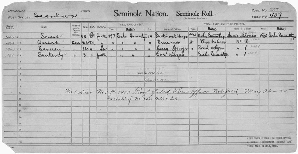| Keywords: Enrollment for Seminole Census Card 437 - NARA - 268011.jpg Scope and content Name Amos Type By Blood Age 25 Sex Male Degree Indian Blood Full Roll Number 1463 City of Residence ee Name Long George Type Parent Sex Male City of Residence tp Name Coe Harjo Type Parent Sex Male City of Residence ee Name Tustinock Harjo Type Parent Sex Male City of Residence ee Name Sarney Type By Blood Age 15 Sex Male Degree Indian Blood 1/2 Roll Number 1464 City of Residence ee Name Sene Type By Blood Age 40 Sex Female Degree Indian Blood Full Roll Number 1462 City of Residence ee Name Sentevey Type By Blood Age 3 Sex Male Degree Indian Blood Full Roll Number 1465 City of Residence ee Name Susie Thlocco Type Parent Sex Female City of Residence ee General notes 268011 Local identifier 75-53A-SEMINOLE 437 Department of the Interior Office of Indian Affairs Office of the Commissioner to the Five Civilized Tribes 1893 - 1914 NARA's Southwest Region Fort Worth NRFA 1400 John Burgess Drive Fort Worth TX 76140 Record group Record Group 75 Records of the Bureau of Indian Affairs 1793 - 1999 Record group ARC 404 Enrollment Cards compiled 1898 - 1914 Series ARC 251747 File unit File unit ARC Variant control numbers NAIL Control Number NRFF-75-53A-23090<br /> NAIL Control Number NRFF-75-53A-32881<br /> NAIL Control Number NRFF-75-53A-34225<br /> NAIL Control Number NRFF-75-53A-35248<br /> NAIL Control Number NRFF-75-53A-45940<br /> NAIL Control Number NRFF-75-53A-46616<br /> NAIL Control Number NRFF-75-53A-46623<br /> NAIL Control Number NRFF-75-53A-48991<br /> NAIL Control Number NRFF-75-53A-SEMINOLE 437 Other versions <gallery> File Enrollment_for_Seminole_Census_Card_437_-_NARA_-_268011 tif tif File Enrollment_for_Seminole_Census_Card_437_-_NARA_-_268011 jpg jpg </gallery> NARA-cooperation PD-USGov Seminole census cards |