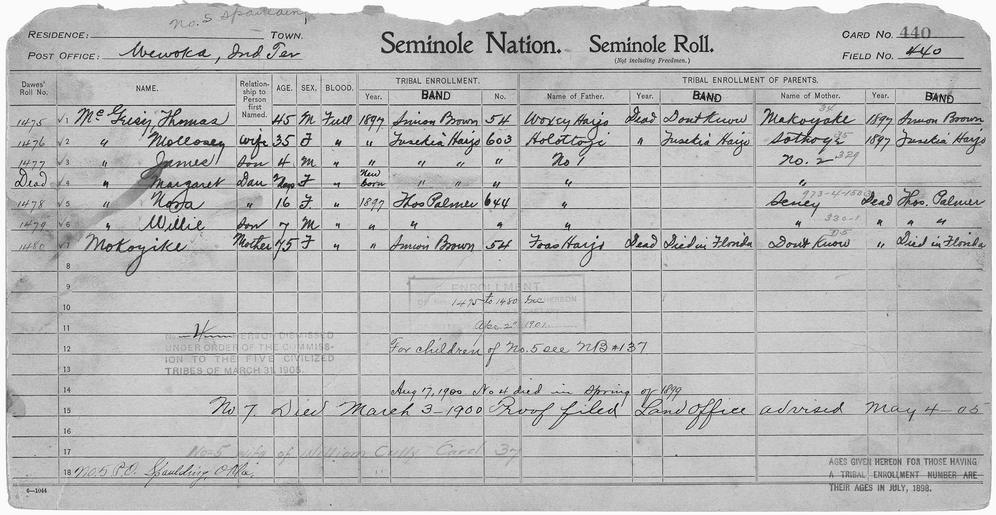 | Keywords: Enrollment for Seminole Census Card 440 - NARA - 268014.tif Scope and content Name Foas Harjo Type Parent Sex Male Name Woxey Harjo Type Parent Sex Male Name Holottoye Type Parent Sex Male City of Residence th Name Makoyake Type Parent Sex Female City of Residence sb Name James McGeisey Type By Blood Age 4 Sex Male Degree Indian Blood Full Roll Number 1477 City of Residence th Name Margaret McGeisey Type By Blood Age 1 Sex Female Degree Indian Blood Full City of Residence th Name Mollosey McGeisey Type By Blood Age 35 Sex Female Degree Indian Blood Full Roll Number 1476 City of Residence th Name Nora McGeisey Type By Blood Age 16 Sex Female Degree Indian Blood Full Roll Number 1478 City of Residence tp Name Thomas McGeisey Type By Blood Age 45 Sex Male Degree Indian Blood Full Roll Number 1475 City of Residence sb Name Mokoyike Type Parent Age 75 Sex Female Degree Indian Blood Full Roll Number 1480 City of Residence sb Name Seney Type Parent Sex Female City of Residence tp Name Sothoge Type Parent Sex Female City of Residence th Name Willie Type By Blood Age 7 Sex Male Degree Indian Blood Full Roll Number 1479 City of Residence tp General notes 268014 Local identifier 75-53A-SEMINOLE 440 Department of the Interior Office of Indian Affairs Office of the Commissioner to the Five Civilized Tribes 1893 - 1914 NARA's Southwest Region Fort Worth NRFA 1400 John Burgess Drive Fort Worth TX 76140 Record group Record Group 75 Records of the Bureau of Indian Affairs 1793 - 1999 Record group ARC 404 Enrollment Cards compiled 1898 - 1914 Series ARC 251747 File unit File unit ARC Variant control numbers NAIL Control Number NRFF-75-53A-34331<br /> NAIL Control Number NRFF-75-53A-35303<br /> NAIL Control Number NRFF-75-53A-36604<br /> NAIL Control Number NRFF-75-53A-40331<br /> NAIL Control Number NRFF-75-53A-41071<br /> NAIL Control Number NRFF-75-53A-41072<br /> NAIL Control Number NRFF-75-53A-41074<br /> NAIL Control Number NRFF-75-53A-41075<br /> NAIL Control Number NRFF-75-53A-41077<br /> NAIL Control Number NRFF-75-53A-42366<br /> NAIL Control Number NRFF-75-53A-46618<br /> NAIL Control Number NRFF-75-53A-47685<br /> NAIL Control Number NRFF-75-53A-51464<br /> NAIL Control Number NRFF-75-53A-SEMINOLE 440 yes Other versions <gallery> File Enrollment_for_Seminole_Census_Card_440_-_NARA_-_268014 tif tif File Enrollment_for_Seminole_Census_Card_440_-_NARA_-_268014 jpg jpg </gallery> NARA-cooperation PD-USGov Seminole census cards NARA TIF images with categorized JPGs |