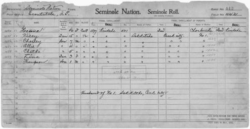 MAKE A MEME View Large Image Enrollment for Seminole Census Card 442 - NARA - 268016.tif Scope and content Name Allie Type By Blood Age 4 Sex Male Degree Indian Blood 1/2 Roll Number 1487 City of Residence k Name Charley Type By Blood Age 7 Sex Male Degree Indian Blood ...