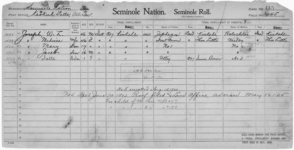 | Keywords: Enrollment for Seminole Census Card 445 - NARA - 268019.tif Scope and content Name Holochetse Type Parent Sex Female City of Residence k Name Jophega Type Parent Sex Male City of Residence k Name Jacob Joseph Type By Blood Age 16 Sex Male Degree Indian Blood Full Roll Number 1501 City of Residence k Name Mary Joseph Type By Blood Age 17 Sex Female Degree Indian Blood Full Roll Number 1500 City of Residence k Name Medisse Joseph Type By Blood Age 46 Sex Female Degree Indian Blood Full Roll Number 1499 City of Residence k Name Salta Joseph Type By Blood Age 1 Sex Female Degree Indian Blood Full Roll Number 1502 City of Residence k Name W L Joseph Type By Blood Sex Male Degree Indian Blood Full Roll Number 1498 City of Residence k Name Miley Type Parent Sex Female City of Residence tl Name Uttey Type Parent Sex Male City of Residence sb General notes 268019 Local identifier 75-53A-SEMINOLE 445 Department of the Interior Office of Indian Affairs Office of the Commissioner to the Five Civilized Tribes 1893 - 1914 NARA's Southwest Region Fort Worth NRFA 1400 John Burgess Drive Fort Worth TX 76140 Record group Record Group 75 Records of the Bureau of Indian Affairs 1793 - 1999 Record group ARC 404 Enrollment Cards compiled 1898 - 1914 Series ARC 251747 File unit File unit ARC Variant control numbers NAIL Control Number NRFF-75-53A-36595<br /> NAIL Control Number NRFF-75-53A-38157<br /> NAIL Control Number NRFF-75-53A-38168<br /> NAIL Control Number NRFF-75-53A-38173<br /> NAIL Control Number NRFF-75-53A-38174<br /> NAIL Control Number NRFF-75-53A-38175<br /> NAIL Control Number NRFF-75-53A-38178<br /> NAIL Control Number NRFF-75-53A-42023<br /> NAIL Control Number NRFF-75-53A-50274<br /> NAIL Control Number NRFF-75-53A-SEMINOLE 445 yes Other versions <gallery> File Enrollment_for_Seminole_Census_Card_445_-_NARA_-_268019 tif tif File Enrollment_for_Seminole_Census_Card_445_-_NARA_-_268019 jpg jpg </gallery> NARA-cooperation PD-USGov Seminole census cards NARA TIF images with categorized JPGs |