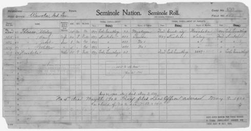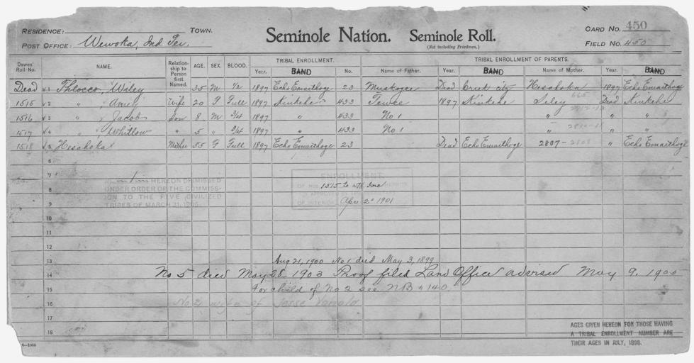 | Keywords: Enrollment for Seminole Census Card 450 - NARA - 268024.jpg Scope and content Name Hesahoka Type Parent Sex Female City of Residence ee Name Hesahoka Type By Blood Age 55 Sex Female Degree Indian Blood Full Roll Number 1518 City of Residence ee Name Muskogee Type Parent Sex Male City of Residence Creek Name Seley Type Parent Sex Female City of Residence k Name Tewee Type Parent Sex Male City of Residence k Name Amey Thlocco Type By Blood Age 20 Sex Female Degree Indian Blood Full Roll Number 1515 City of Residence k Name Jacob Thlocco Type By Blood Age 8 Sex Male Degree Indian Blood 3/4 Roll Number 1516 City of Residence k Name Whitlow Thlocco Type By Blood Age 5 Sex Male Degree Indian Blood 3/4 Roll Number 1517 City of Residence k Name Wiley Thlocco Type By Blood Age 35 Sex Male Degree Indian Blood 1/2 City of Residence ee General notes 268024 Local identifier 75-53A-SEMINOLE 450 Department of the Interior Office of Indian Affairs Office of the Commissioner to the Five Civilized Tribes 1893 - 1914 NARA's Southwest Region Fort Worth NRFA 1400 John Burgess Drive Fort Worth TX 76140 Record group Record Group 75 Records of the Bureau of Indian Affairs 1793 - 1999 Record group ARC 404 Enrollment Cards compiled 1898 - 1914 Series ARC 251747 File unit File unit ARC Variant control numbers NAIL Control Number NRFF-75-53A-36155<br /> NAIL Control Number NRFF-75-53A-36156<br /> NAIL Control Number NRFF-75-53A-42865<br /> NAIL Control Number NRFF-75-53A-46458<br /> NAIL Control Number NRFF-75-53A-48915<br /> NAIL Control Number NRFF-75-53A-48963<br /> NAIL Control Number NRFF-75-53A-48980<br /> NAIL Control Number NRFF-75-53A-48996<br /> NAIL Control Number NRFF-75-53A-48997<br /> NAIL Control Number NRFF-75-53A-SEMINOLE 450 Other versions <gallery> File Enrollment_for_Seminole_Census_Card_450_-_NARA_-_268024 tif tif File Enrollment_for_Seminole_Census_Card_450_-_NARA_-_268024 jpg jpg </gallery> NARA-cooperation PD-USGov Seminole census cards |