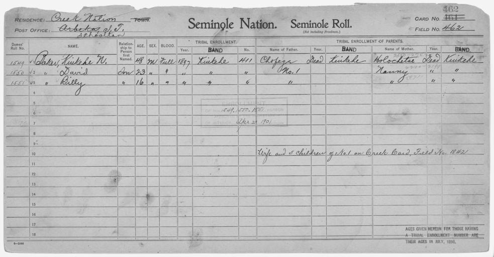 | Keywords: Enrollment for Seminole Census Card 462 - NARA - 268036.jpg Scope and content Name Billy Baker Type By Blood Age 16 Sex Male Degree Indian Blood Full Roll Number 1551 City of Residence k Name David Baker Type By Blood Age 23 Sex Male Degree Indian Blood Full Roll Number 1550 City of Residence k Name Kinkehe N Baker Type By Blood Age 48 Sex Male Degree Indian Blood Full Roll Number 1549 City of Residence k Name Chofege Type Parent Sex Male City of Residence k Name Holochetse Type Parent Sex Female City of Residence k Name Nanny Type Parent Sex Female City of Residence k General notes 268036 Local identifier 75-53A-SEMINOLE 462 Department of the Interior Office of Indian Affairs Office of the Commissioner to the Five Civilized Tribes 1893 - 1914 NARA's Southwest Region Fort Worth NRFA 1400 John Burgess Drive Fort Worth TX 76140 Record group Record Group 75 Records of the Bureau of Indian Affairs 1793 - 1999 Record group ARC 404 Enrollment Cards compiled 1898 - 1914 Series ARC 251747 File unit File unit ARC Variant control numbers NAIL Control Number NRFF-75-53A-23648<br /> NAIL Control Number NRFF-75-53A-23652<br /> NAIL Control Number NRFF-75-53A-23670<br /> NAIL Control Number NRFF-75-53A-27963<br /> NAIL Control Number NRFF-75-53A-36596<br /> NAIL Control Number NRFF-75-53A-42955<br /> NAIL Control Number NRFF-75-53A-SEMINOLE 462 Other versions <gallery> File Enrollment_for_Seminole_Census_Card_462_-_NARA_-_268036 tif tif File Enrollment_for_Seminole_Census_Card_462_-_NARA_-_268036 jpg jpg </gallery> NARA-cooperation PD-USGov Seminole census cards |
