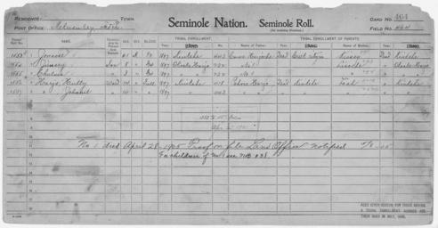 | Keywords: Enrollment for Seminole Census Card 464 - NARA - 268038.tif Scope and content Name Chulma Type By Blood Age 3 Sex Male Degree Indian Blood 3/4 Roll Number 1555 City of Residence oh Name Hully Harjo Type By Blood Age 14 Sex Male Degree Indian Blood Full Roll Number 1556 City of Residence k Name Johnnie Harjo Type By Blood Age 14 Sex Male Degree Indian Blood Full Roll Number 1557 City of Residence k Name Pahose Harjo Type Parent Sex Male City of Residence k Name Cowe Harjoche Type Parent Sex Male City of Residence Creek Name Jimsey Type By Blood Age 8 Sex Male Degree Indian Blood 3/4 Roll Number 1554 City of Residence oh Name Jonasse Type By Blood Age 41 Sex Male Degree Indian Blood 1/2 Roll Number 1553 City of Residence k Name Kissey Type Parent Sex Female City of Residence k Name Leah Type Parent Sex Female City of Residence k Name Lisoche Type Parent Sex Female City of Residence oh General notes 268038 Local identifier 75-53A-SEMINOLE 464 Department of the Interior Office of Indian Affairs Office of the Commissioner to the Five Civilized Tribes 1893 - 1914 NARA's Southwest Region Fort Worth NRFA 1400 John Burgess Drive Fort Worth TX 76140 Record group Record Group 75 Records of the Bureau of Indian Affairs 1793 - 1999 Record group ARC 404 Enrollment Cards compiled 1898 - 1914 Series ARC 251747 File unit File unit ARC Variant control numbers NAIL Control Number NRFF-75-53A-28042<br /> NAIL Control Number NRFF-75-53A-34425<br /> NAIL Control Number NRFF-75-53A-34511<br /> NAIL Control Number NRFF-75-53A-34940<br /> NAIL Control Number NRFF-75-53A-35357<br /> NAIL Control Number NRFF-75-53A-37632<br /> NAIL Control Number NRFF-75-53A-38021<br /> NAIL Control Number NRFF-75-53A-38786<br /> NAIL Control Number NRFF-75-53A-39209<br /> NAIL Control Number NRFF-75-53A-39571<br /> NAIL Control Number NRFF-75-53A-SEMINOLE 464 yes Other versions <gallery> File Enrollment_for_Seminole_Census_Card_464_-_NARA_-_268038 tif tif File Enrollment_for_Seminole_Census_Card_464_-_NARA_-_268038 jpg jpg </gallery> NARA-cooperation PD-USGov Seminole census cards NARA TIF images with categorized JPGs |